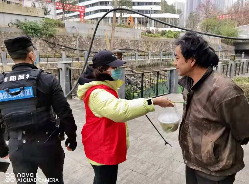南明区太慈桥街道办事处国际城2社区支部书记 母光煜:“我们是5号的时候在社区巡逻时,看到一个流浪乞讨人员,因为天气比较寒冷,也怕他发生什么意外,我们当时就跟社区管段民警取得联系。当时就买东西给他吃,然后把他送到派出所。”