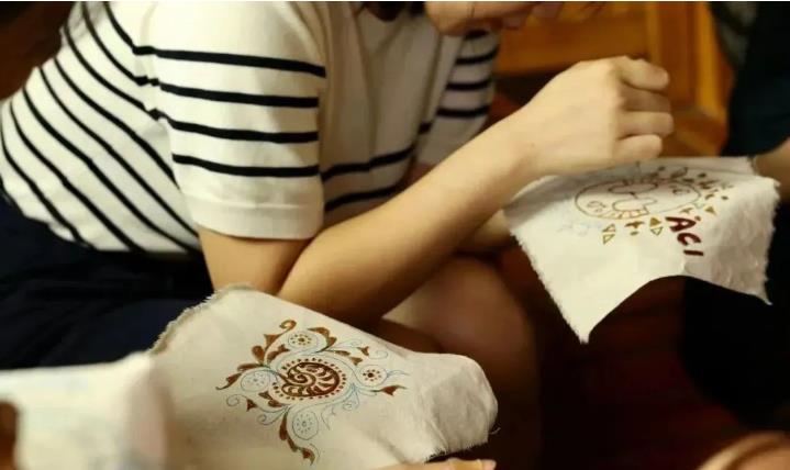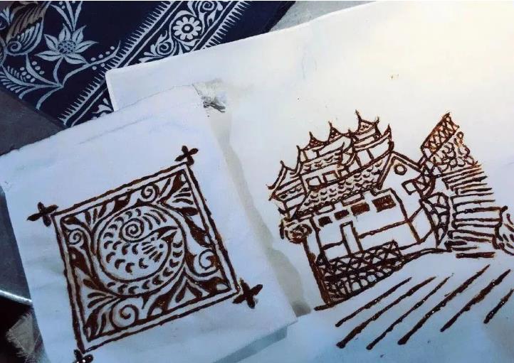 当两种油融合后,用竹刀或木签蘸油勾画图案,蜡干后再经浸染、漂洗、去蜡、阴干等工序,便可制成不同色彩的图案。