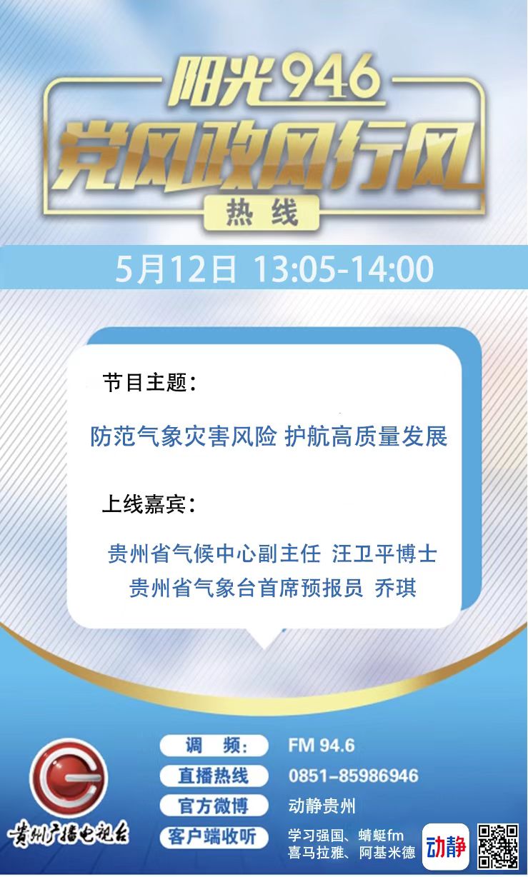 如何做好气象灾害的防灾减灾?13:05,贵州省气候中心副主任汪卫平、贵州省气象台首席预报员乔琪将做客《阳光946党风政风行风热线》与大家进行交流,欢迎拨打直播热线0851-85986946参与节目。