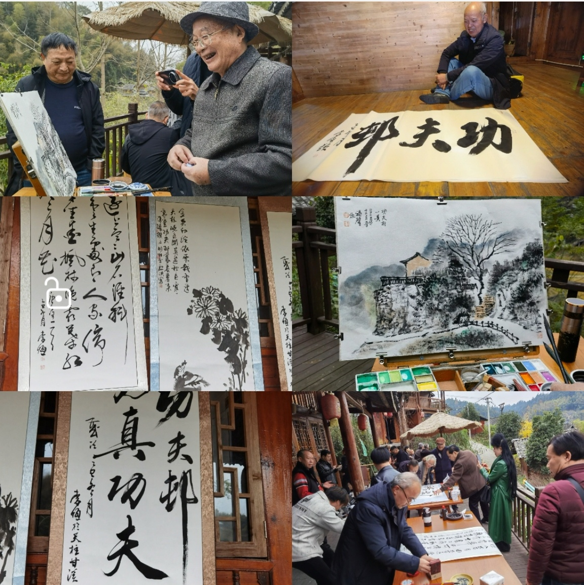 在功夫村,由村里男女老幼齐演独特“侗家功夫”武术技艺,让采风团感受到天柱人民尚武坚韧的精神风貌,叹服天柱人民与政府一致发展的步调默契和协调。贵州学派秘书长殷平当即表态把功夫村作为学派采风创作基地。中美协会员、国家一级美术师沈福馨当场挥毫创作山水画作,赠予功夫村永久收藏,以艺术形式铭记这段文化交流的情谊。著名书法家李恒,当即书写苍劲有力“功夫村”“功夫村见真功夫”等作品!著名画家付洪琳与著名书法家曾明林商议,邀请原功夫村第一书记陈臻作诗“金英初绽依云栽,香透天柱晓色开。莫道深秋寒意重,功夫村里看春来。”三人合著集“诗书画”为一体的《功夫菊》作品赠送功夫村永久收藏!