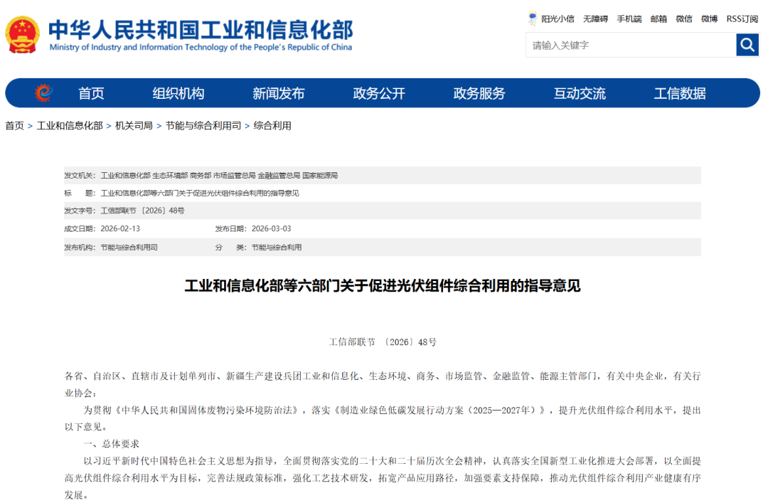 3月3日,工业和信息化部等六部门发布促进光伏组件综合利用的指导意见,以全面提高光伏组件综合利用水平为目标,推动光伏组件综合利用产业健康有序发展。