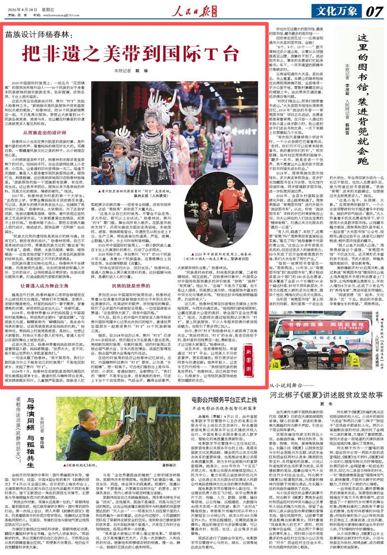 今天(4月24日),《人民日报海外版》刊发新闻《 苗族设计师杨春林:把非遗之美带到国际T台》。