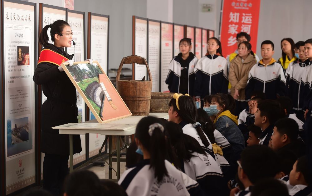 2020年10月21日,在河北沧州青县大杜庄中学,讲解员为学生讲解运河沧州段谢家坝的构造。河北沧州博物馆“运河文化校园巡回展”活动先后走进9所大中小学,旨在让学生对京杭大运河及运河文化有更多认识和了解。新华社记者 王民 摄