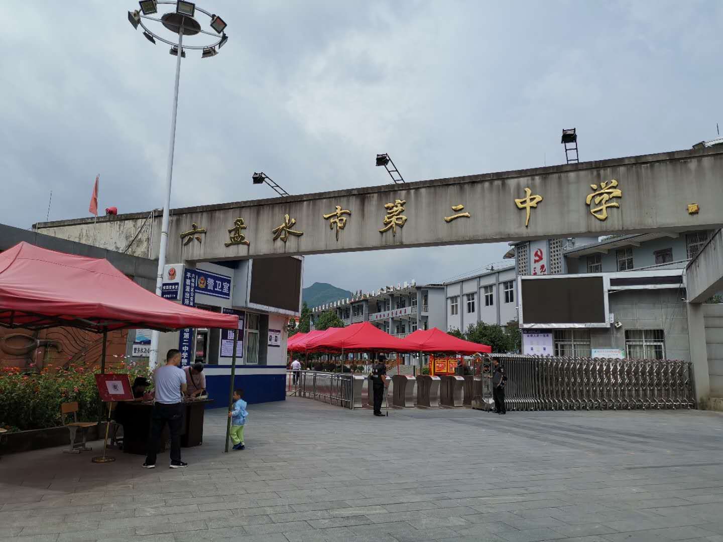当栏目记者来到六盘水市第二中学的校门口,发现学校门卫值守依然严格,疫情防控工作没有丝毫的松懈。特别的是,值守的除了保安人员之外,还专门设了一个“党员先锋岗”。