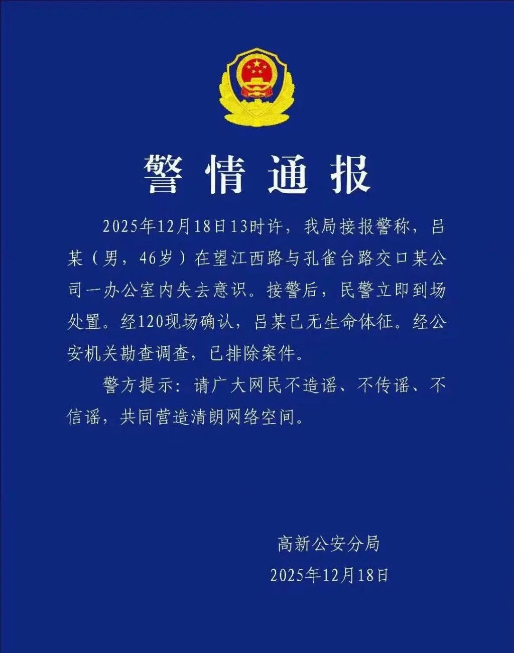 12月18日晚间,合肥高新公安分局发布警情通报。通报称:2025年12月18日13时许,我局接报警称,吕某(男,46岁)在望江西路与孔雀台路交口某公司一办公室内失去意识,接警后,民警立即到场处置。经120现场确认,吕某已无生命体征。经公安机关勘查调查,已排除案件。