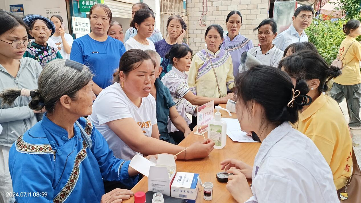 最后,实践团在册亨县双江镇洛央村(原达秧乡街上)开展爱心义诊活动。实践团成员根据村民实际需求导诊分流,配合医生协助检查,并力所能及地开展测量血糖血压、肩颈按摩、艾灸服务等医疗服务,认真细致地接诊患者100余名,现场人头攒动,气氛热烈而有序。