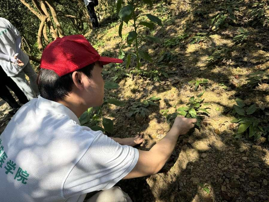 在册亨县双江镇顶肖村,镇党委书记王光福一行带领实践团成员实地参观了林下套种中药材“淫羊藿”示范种植基地,领略林下种植,一林多用的新魅力。实践团成员也对淫羊藿这一中药材的种植和用途有了更丰富的认识。