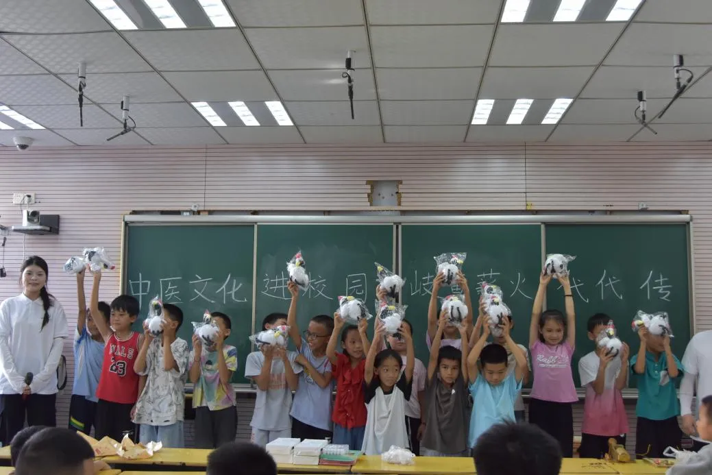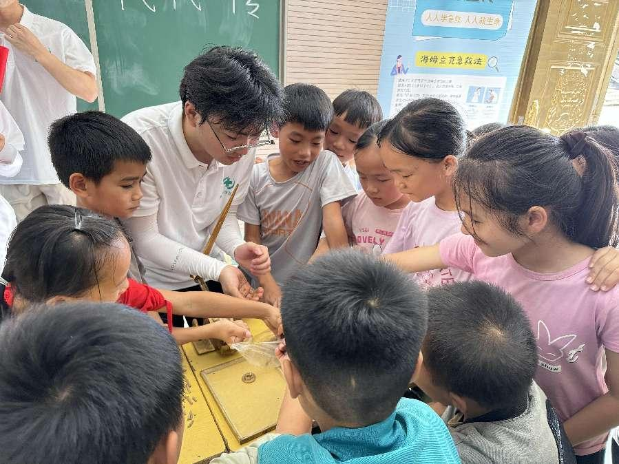 随后,实践团成员到达双江镇民族中心学校与小学生以做游戏的方式宣传中医药文化知识,带领小学生辨识中药,制作中医药香,学习八段锦和太极拳的招式。此外,还教授小学生一些常用急救知识,特别向他们介绍了海姆立克急救法。在场的小学生们都聚精会神,踊跃体验互动。