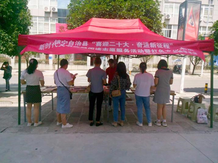 2022年9月3日下午,安顺市新华书店有限公司镇宁县分公司走进镇宁自治县迎阳社区开展“喜迎党的二十大 奋进新征程”新时代文明实践阅读志愿服务活动暨红色文化书展。