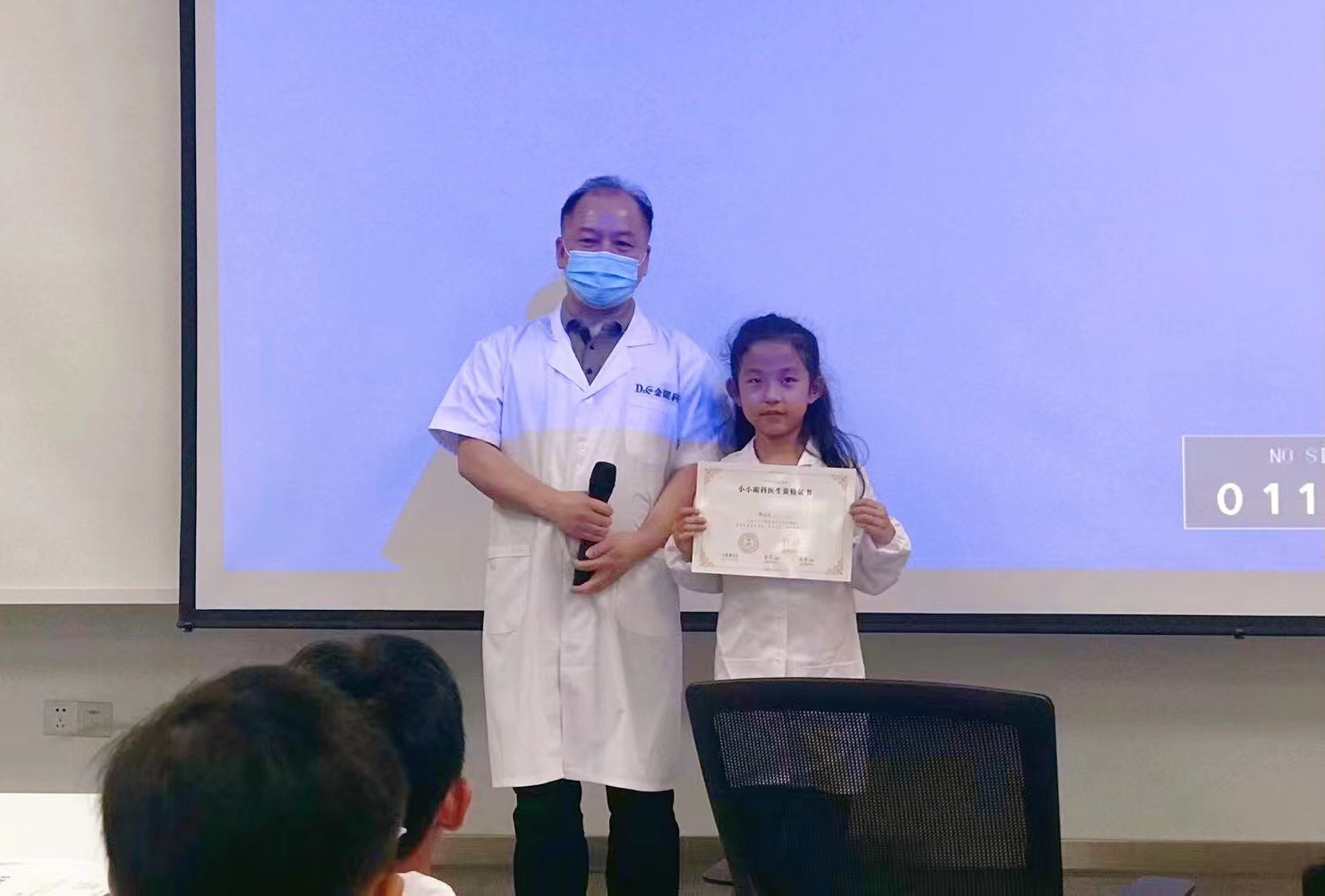 体验活动结束后,金眼科院长为小朋友们颁发爱眼宣传员的证书及礼品,与参加活动的小朋友们留影,并再次叮嘱小朋友们平时要多注意眼睛、保护好眼睛。