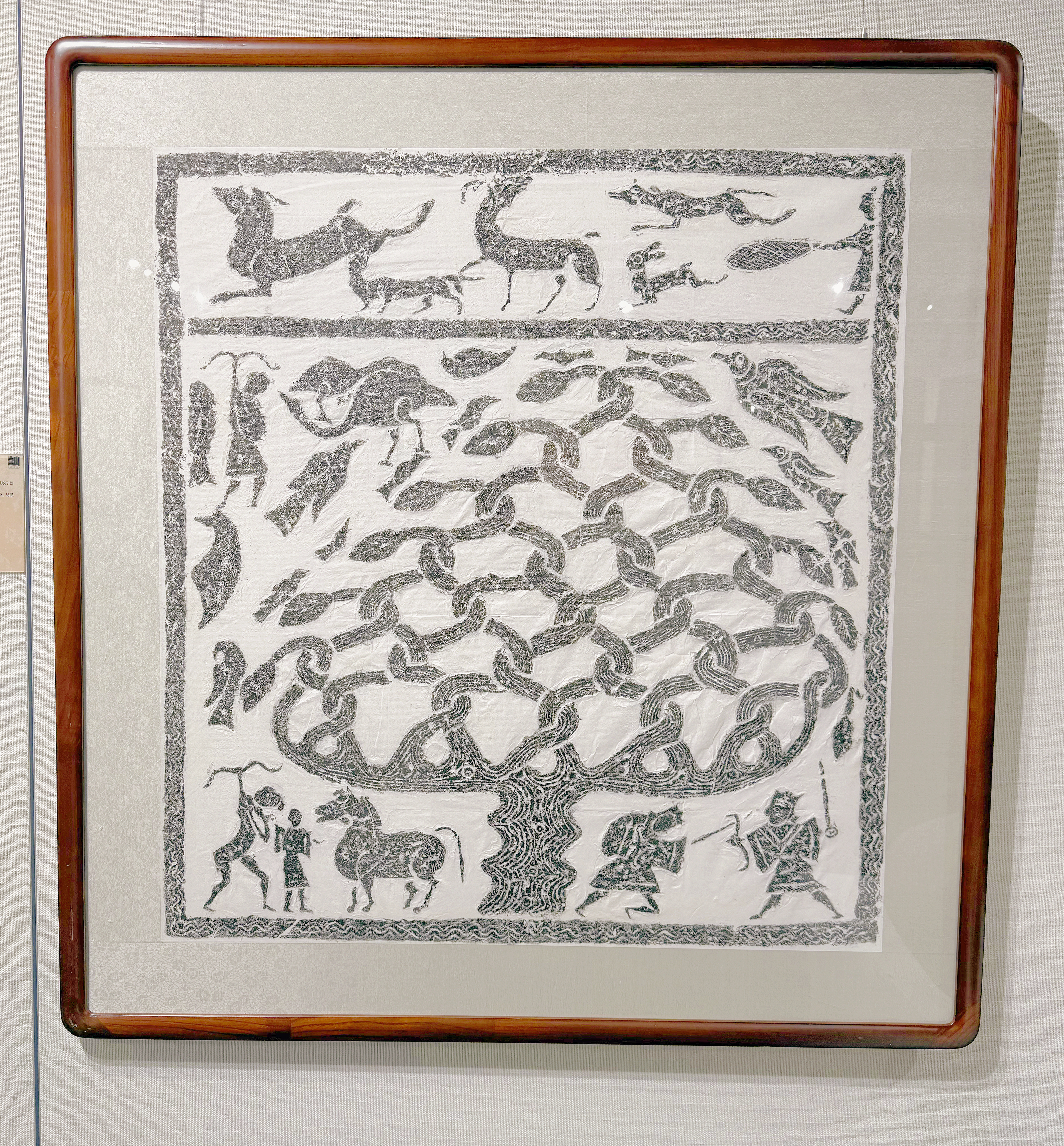 汉画像拓片题材包罗万象,被誉为“绣像的汉代史”“汉代的百科全书”。展品中既有周公辅成王、大禹治水等彰显儒家忠孝节义的历史典故,也有车马出行、乐舞百戏、宴饮庖厨、农耕狩猎等生活场景,更有西王母、东王公、伏羲女娲等神话形象与祥禽瑞兽,全方位展现了汉代的社会生活、文化信仰与精神追求。