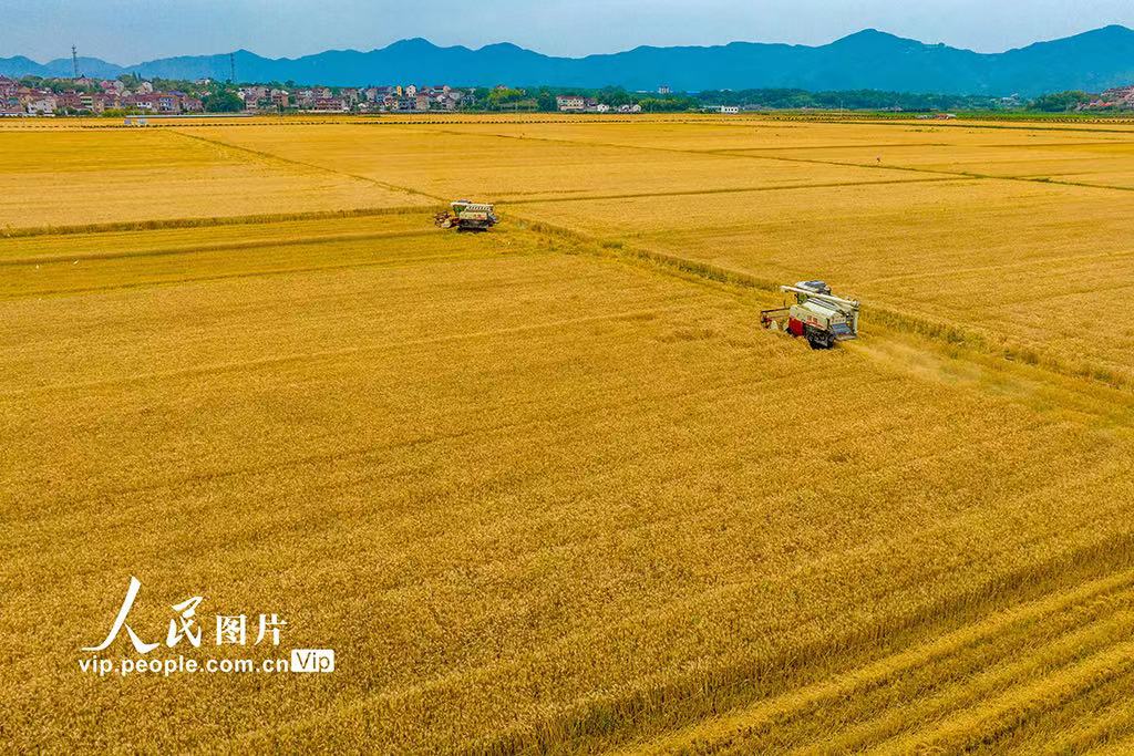 2023年5月26日,浙江省绍兴市嵊州市三界镇长桥村麦子熟了,收割机正在田地里进行收割。