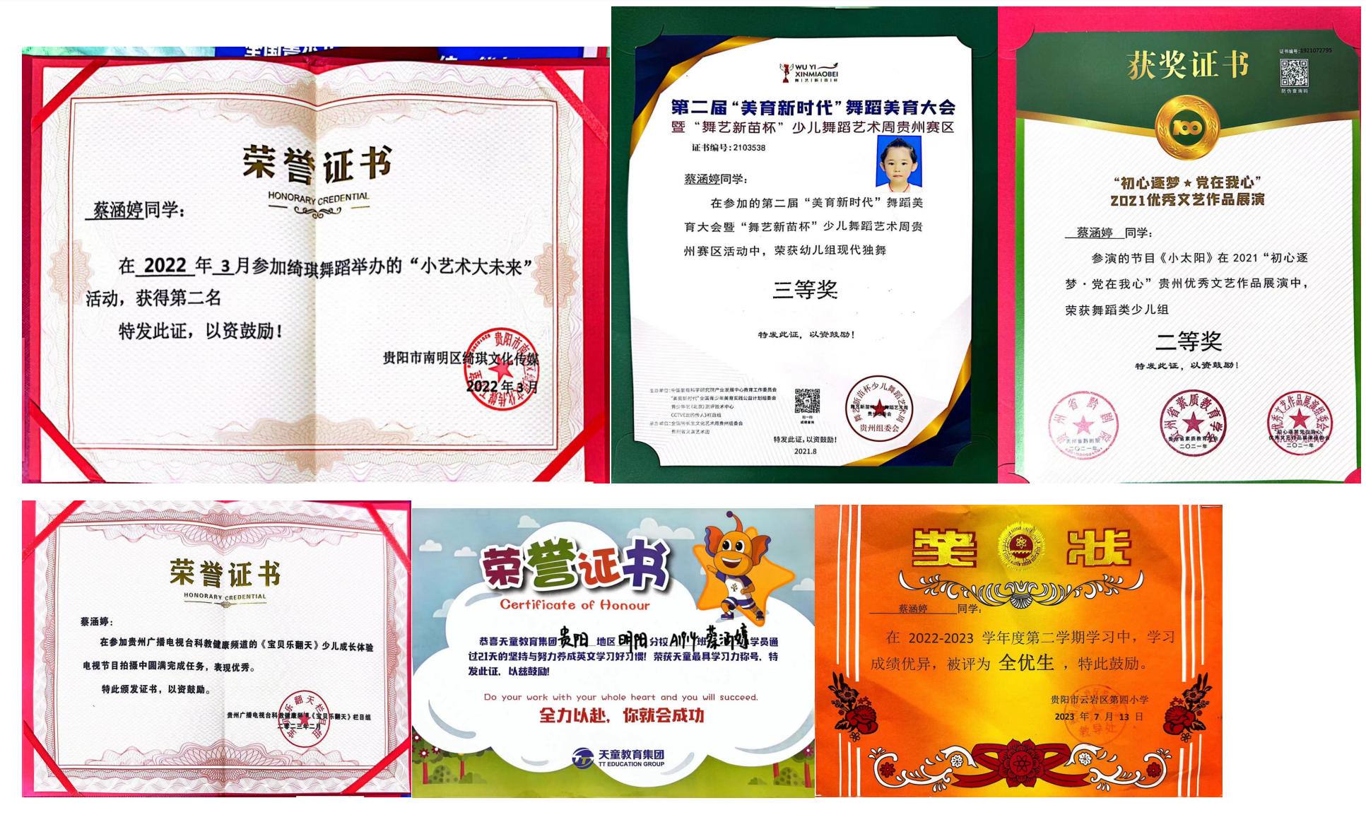 2023年3月参加贵州广播电视台《宝贝乐翻天》少儿成长体验电视剧节目拍摄中圆满完成任务,表现优秀,并获得荣誉证书;