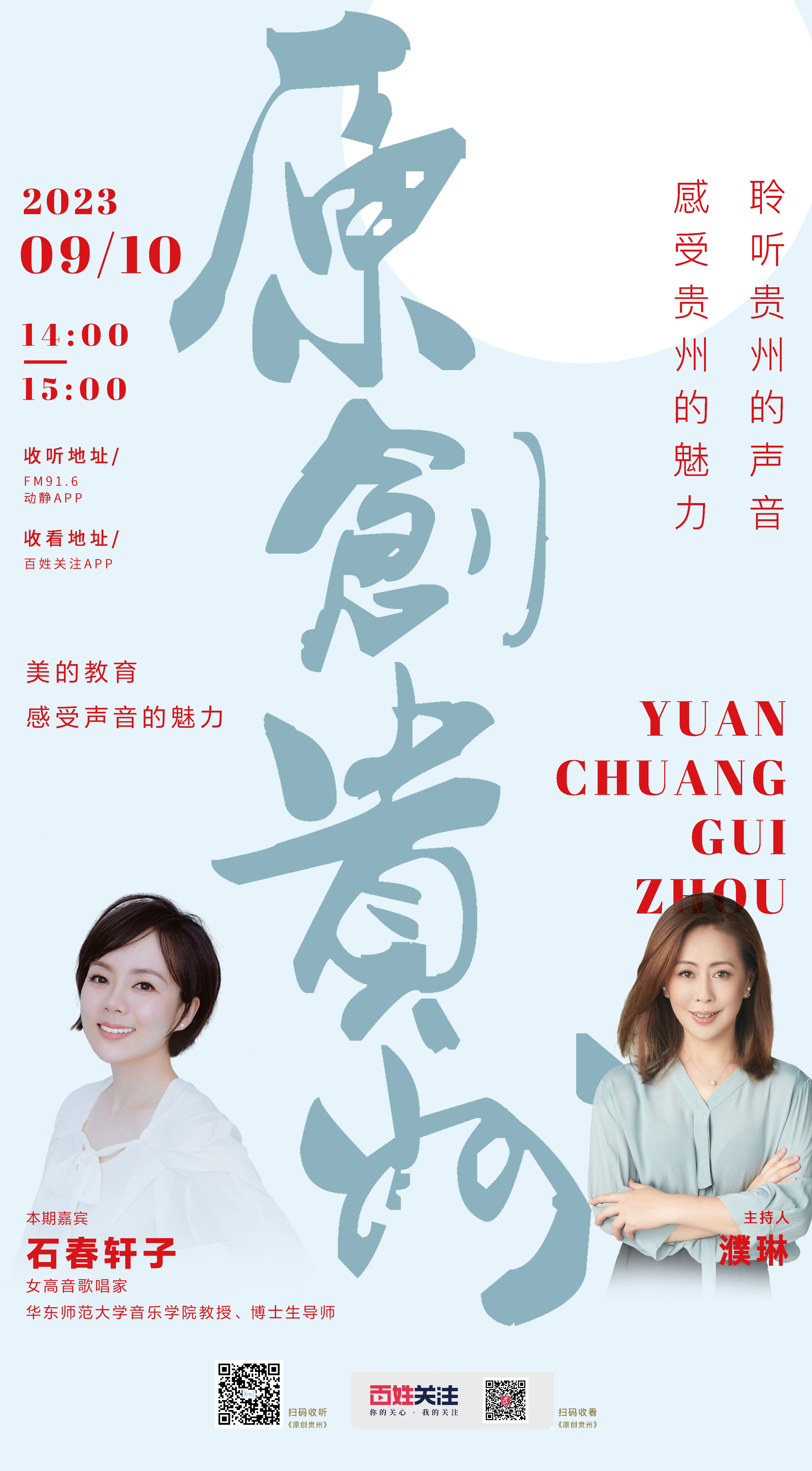 FM91.6贵州音乐广播9月10日14:00,女高音歌唱家,华东师范大学音乐学院教授、博士生导师石春轩子走进《原创贵州·对话丨教师节特别节目》,美的教育——感受声音的魅力。