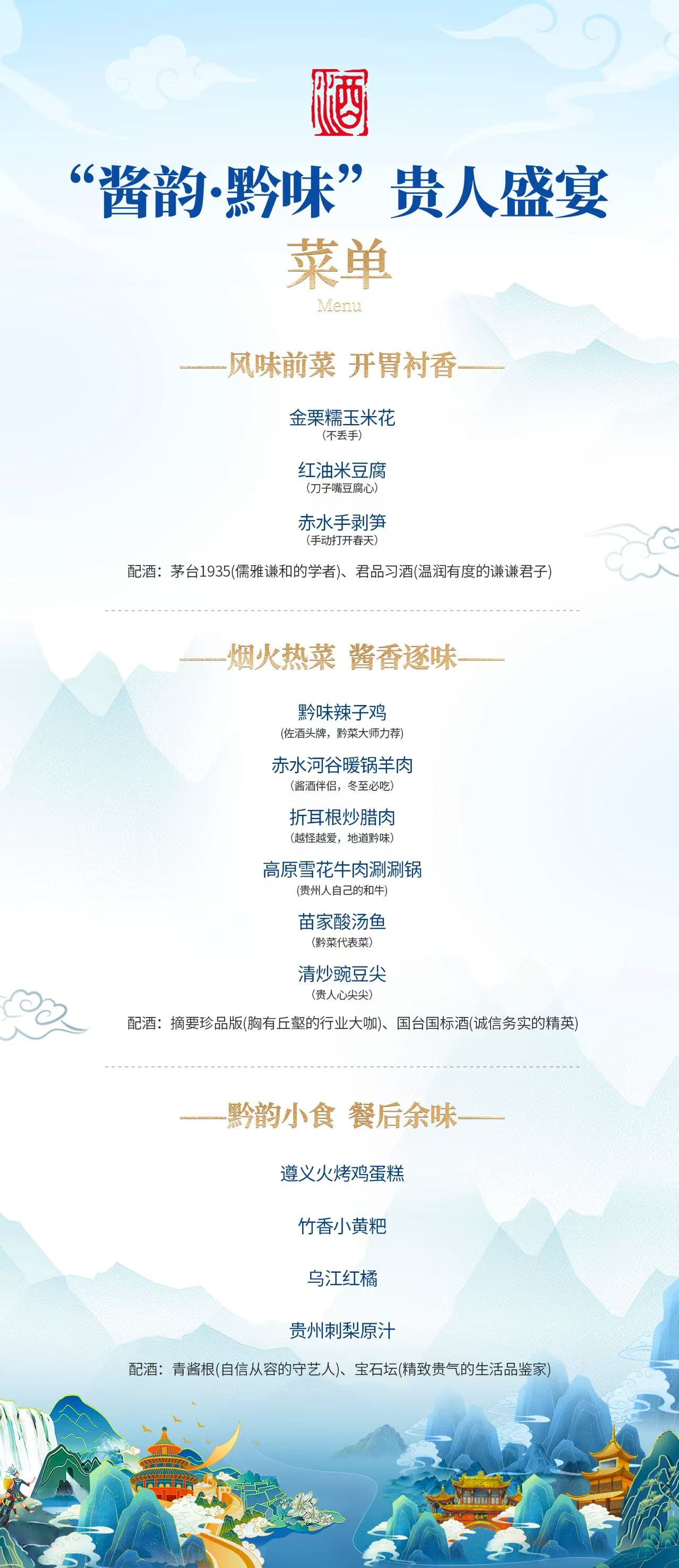 活动发布了“酱韵·黔味”主题菜单,精选遵义核心产区酱酒系列,搭配贵州浓香酸汤鱼、黔味寻香辣子鸡、酸汤雪花牛肉、遵义绵甜鸡蛋糕、赤水手剥嫩笋等十余道风味独特的经典黔菜,从热菜到小吃,从陈酿到新酒,每一组搭配都呈现出贵州的山水之灵、匠心之暖、烟火之欢。