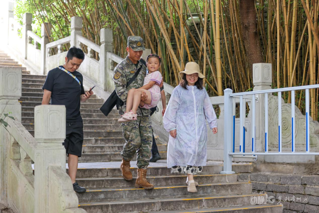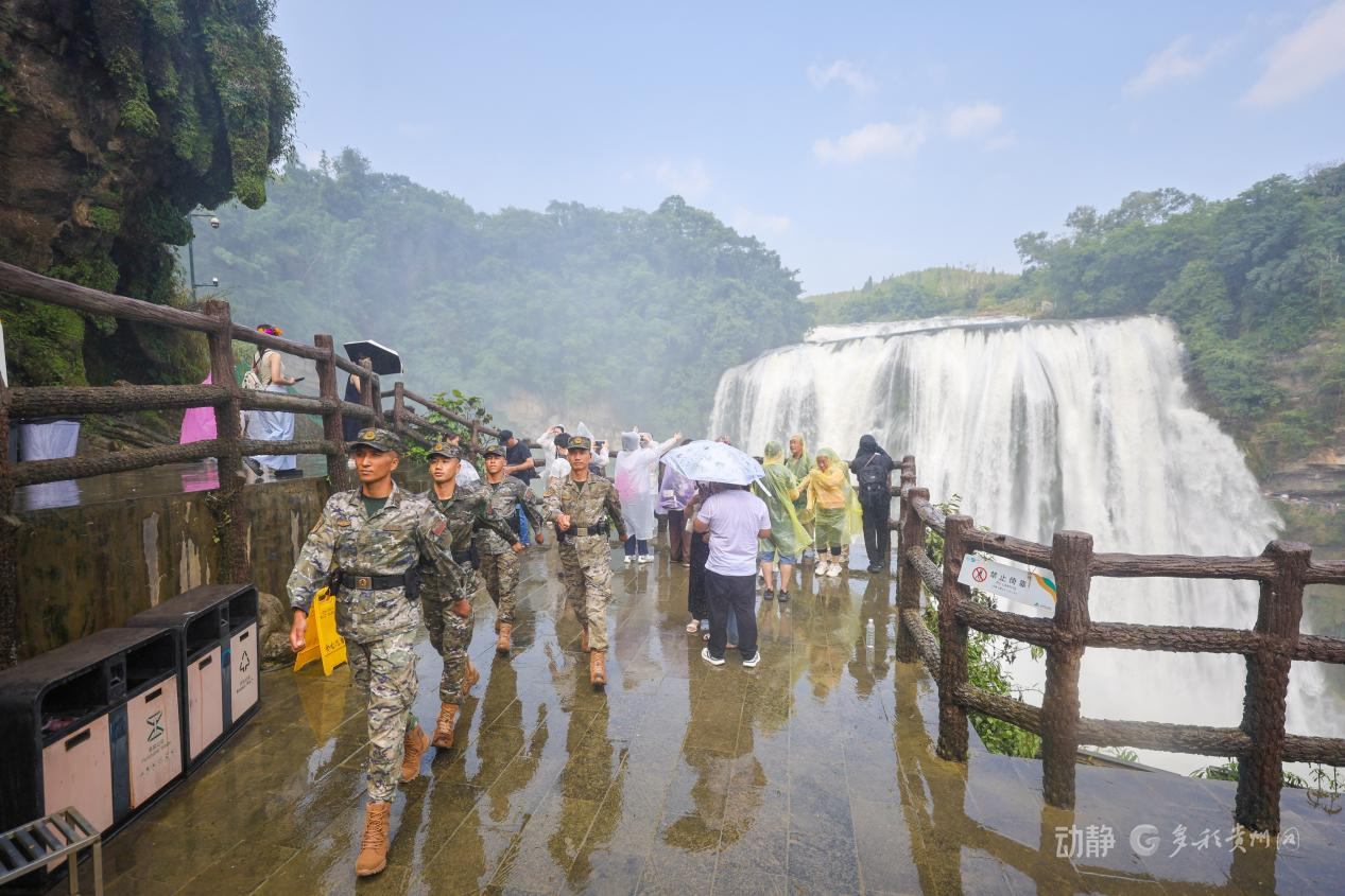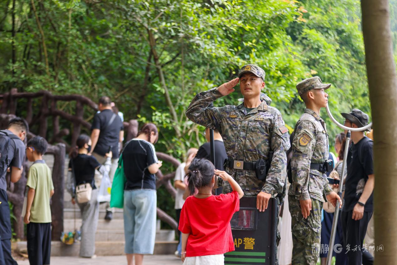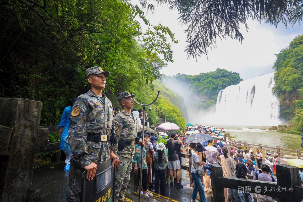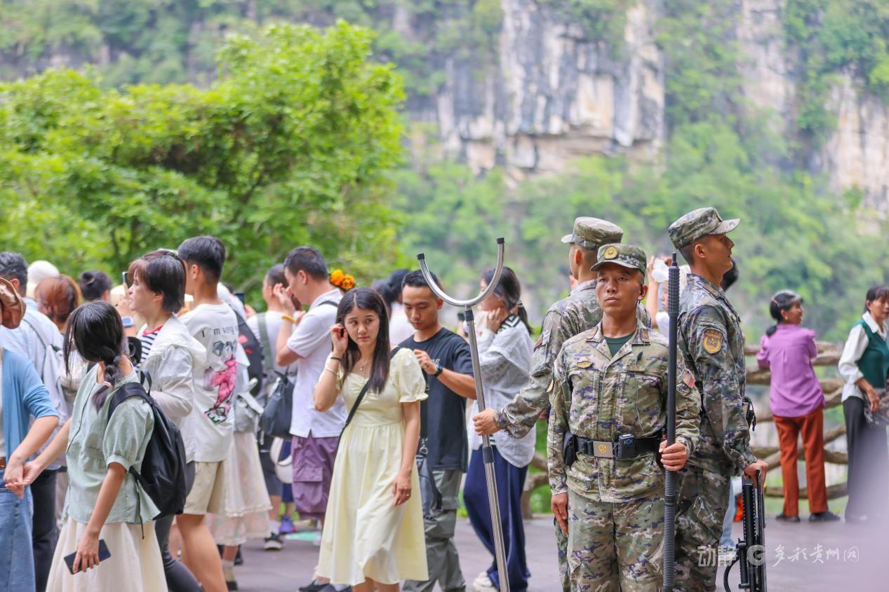 为确保景区安全有序,武警贵州总队安顺支队的官兵们顶着烈日酷暑,坚守执勤一线为游客提供安全保障和暖心服务。