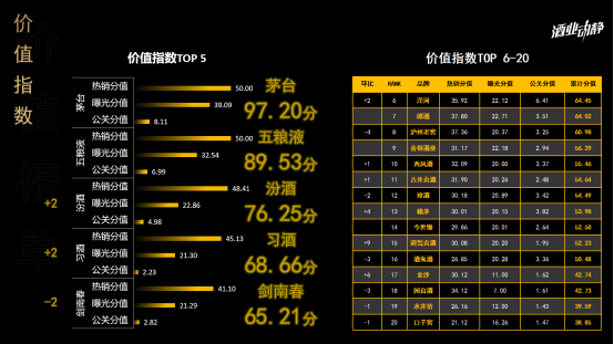 曝光分值方面,茅台与五粮液稳居前二,这与其密集的高端事件矩阵直接相关。