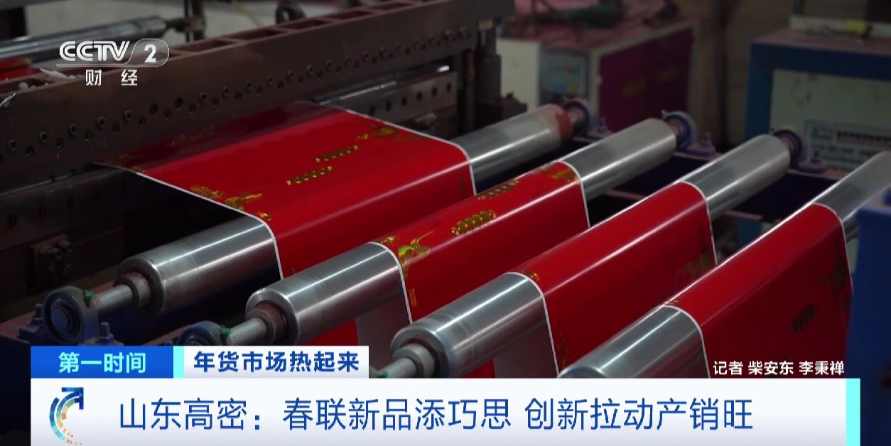 这两天,山东高密市夏庄镇东李家村的春联加工厂车间内,自动化生产线以每分钟30多副的速度高效运转,红纸经激光镂刻、烫金压膜等工序后,变成带有浮雕质感和鎏金光泽的精致楹联。