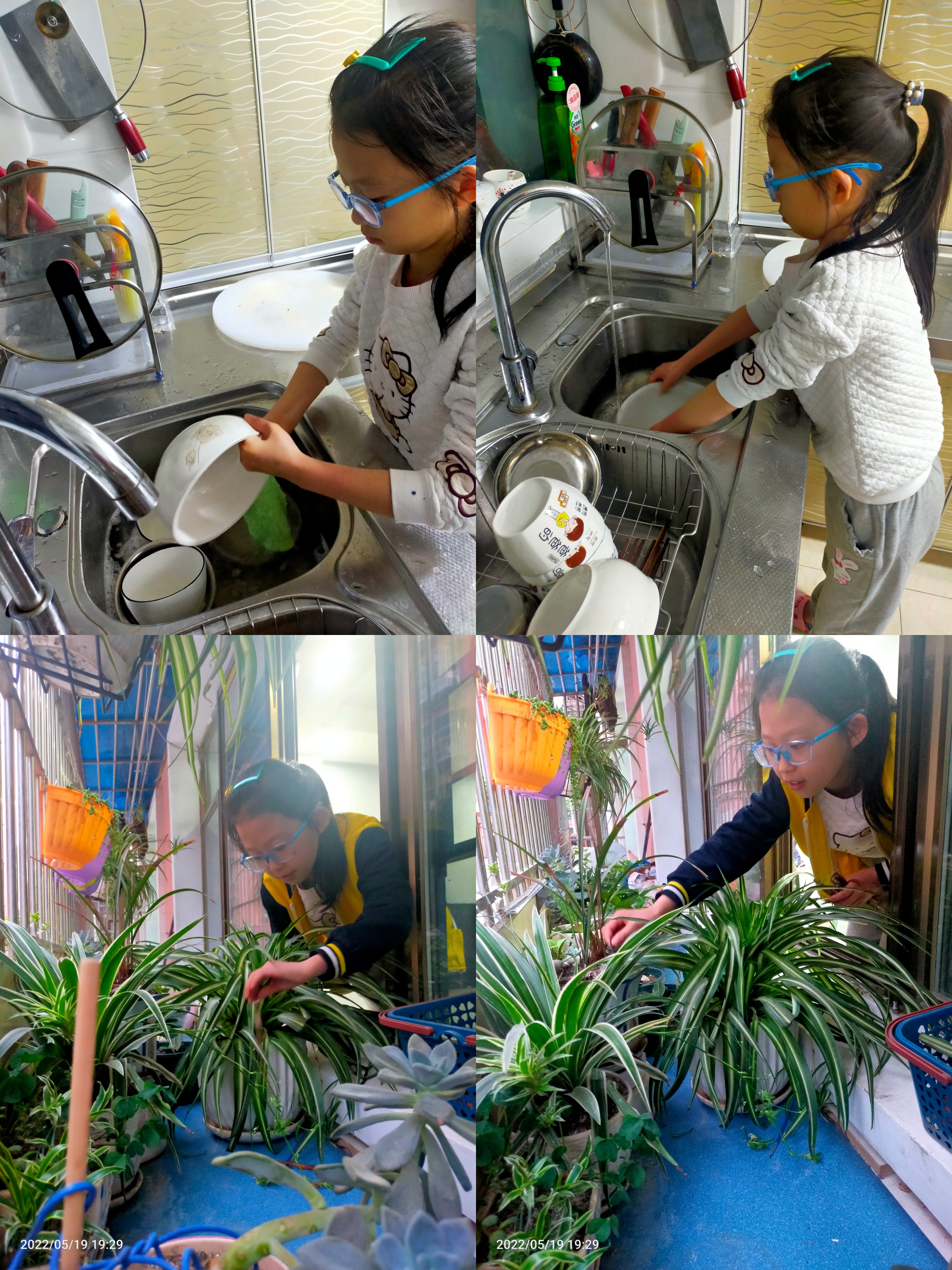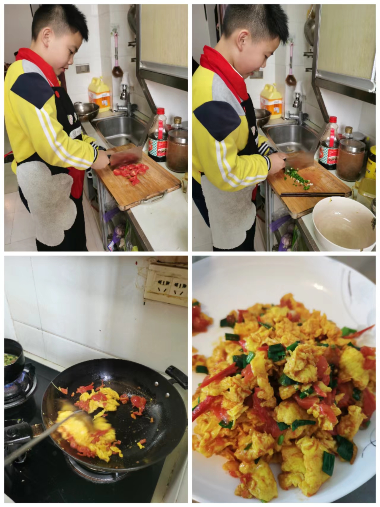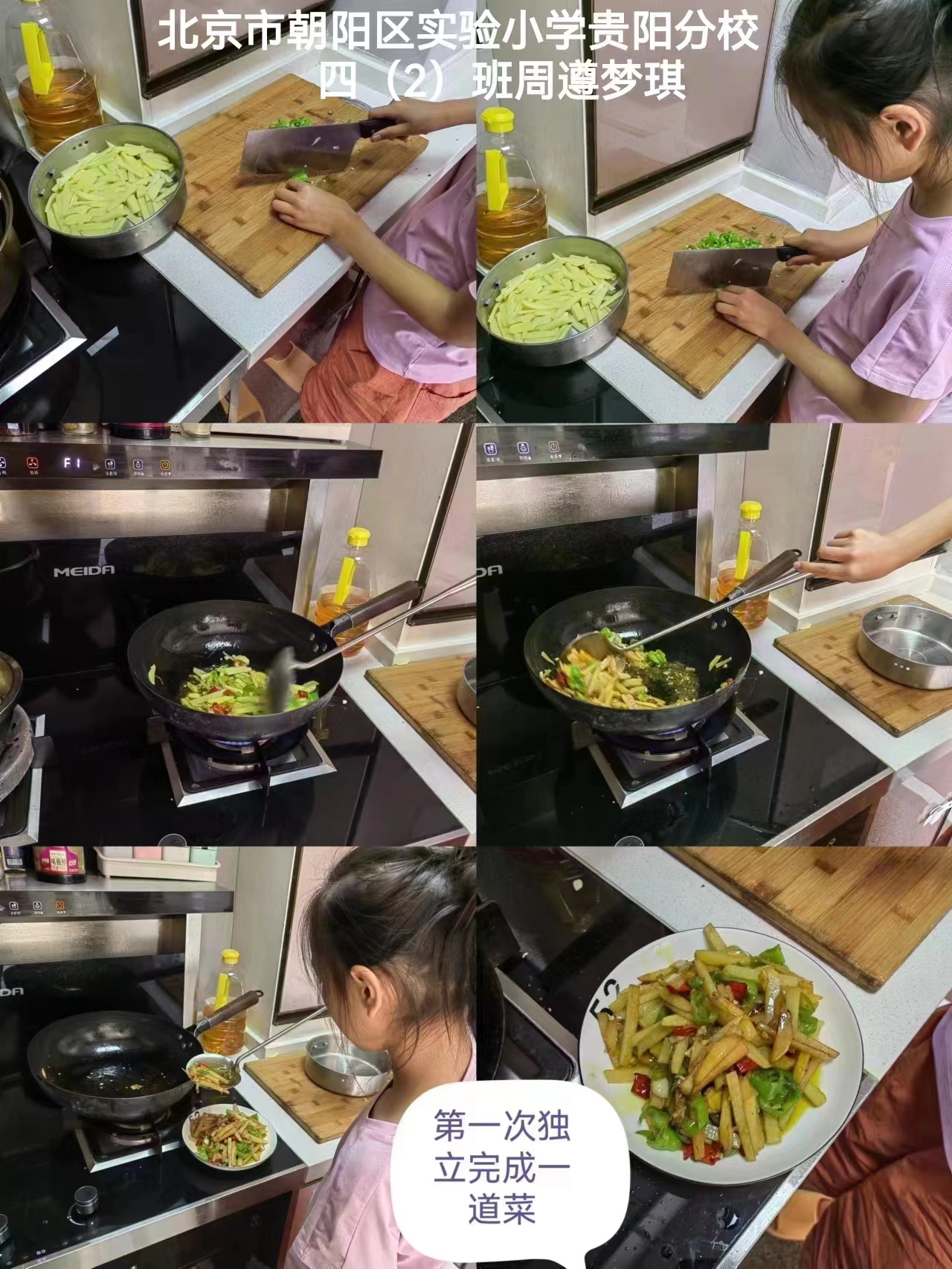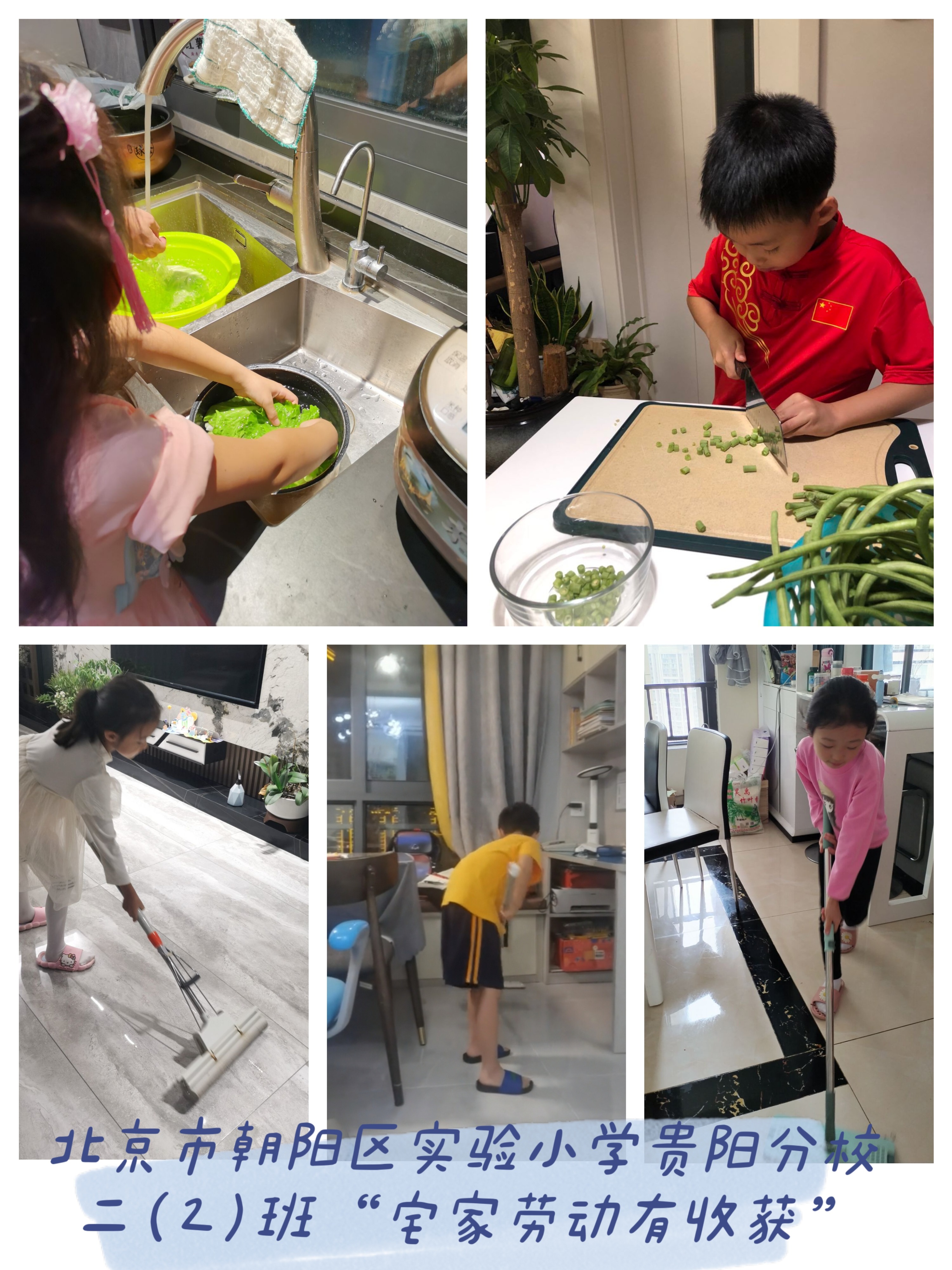 北京市朝阳区实验小学贵阳分校的同学们在家里进行洗菜、切菜、拖地、炒菜等劳动