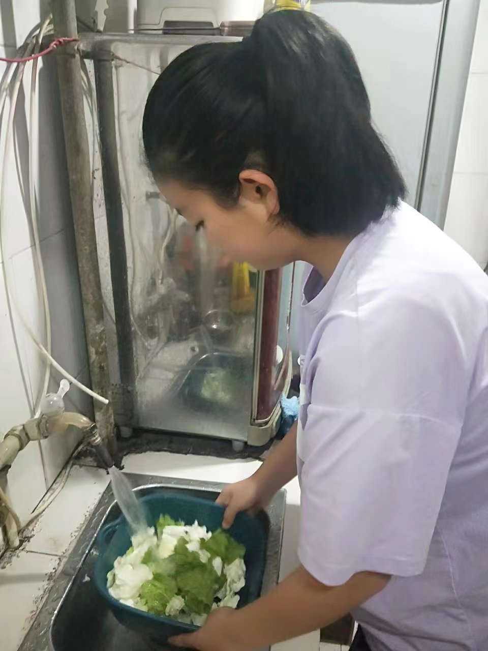 花果园第一小学的同学们进行切菜、洗菜、抹桌子、炒菜劳动