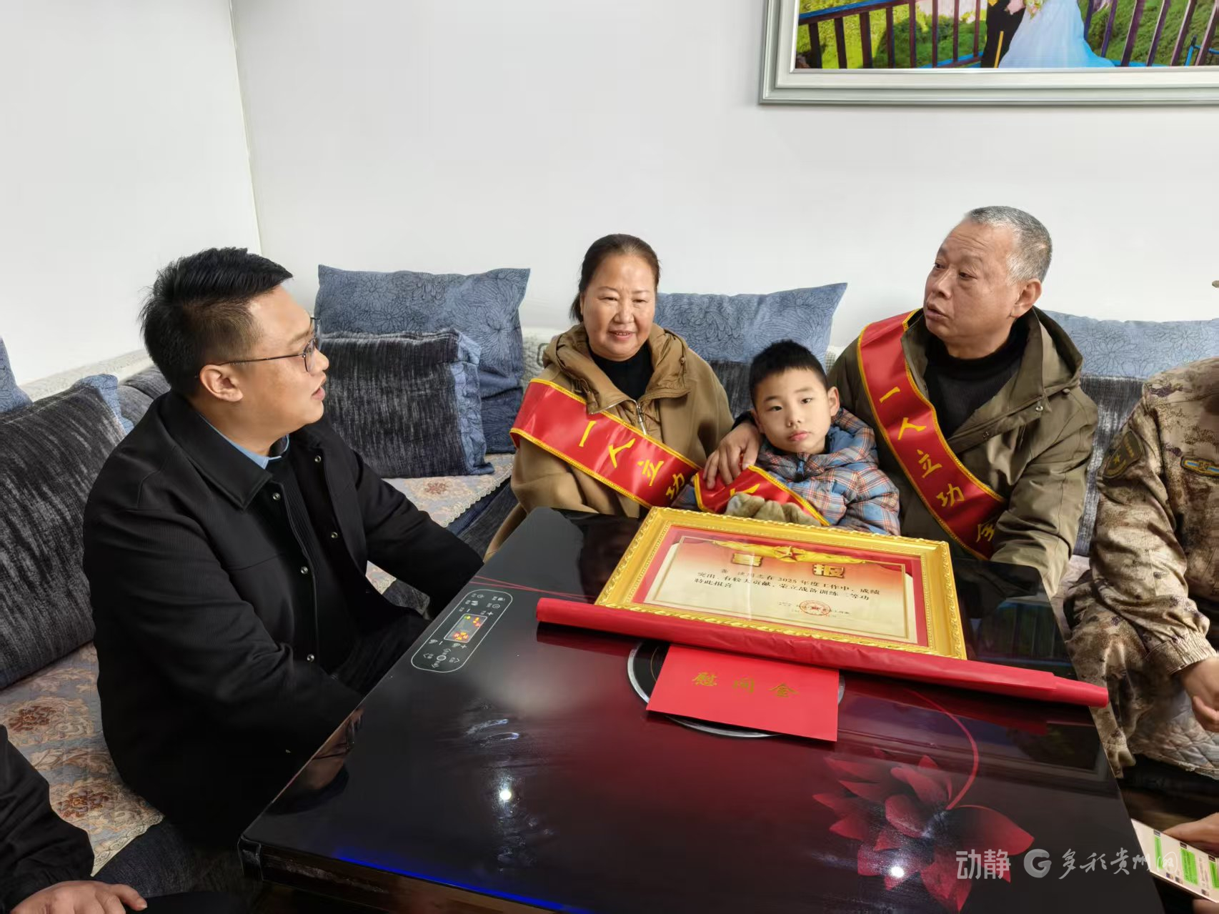 “报喜团”的第一站来到位于贵安新区新艺厂的龚捷家中。贵阳市退役军人事务局党委委员、市退役军人服务中心主任贺威代表“报喜团”为龚捷家属佩戴绶带,并送上立功喜报和慰问金。