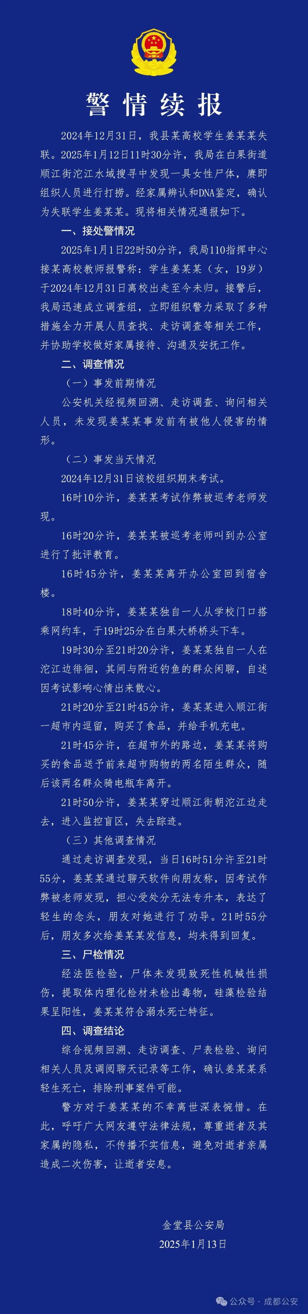 2025年1月13日,成都金堂县公安局发布警情续报: