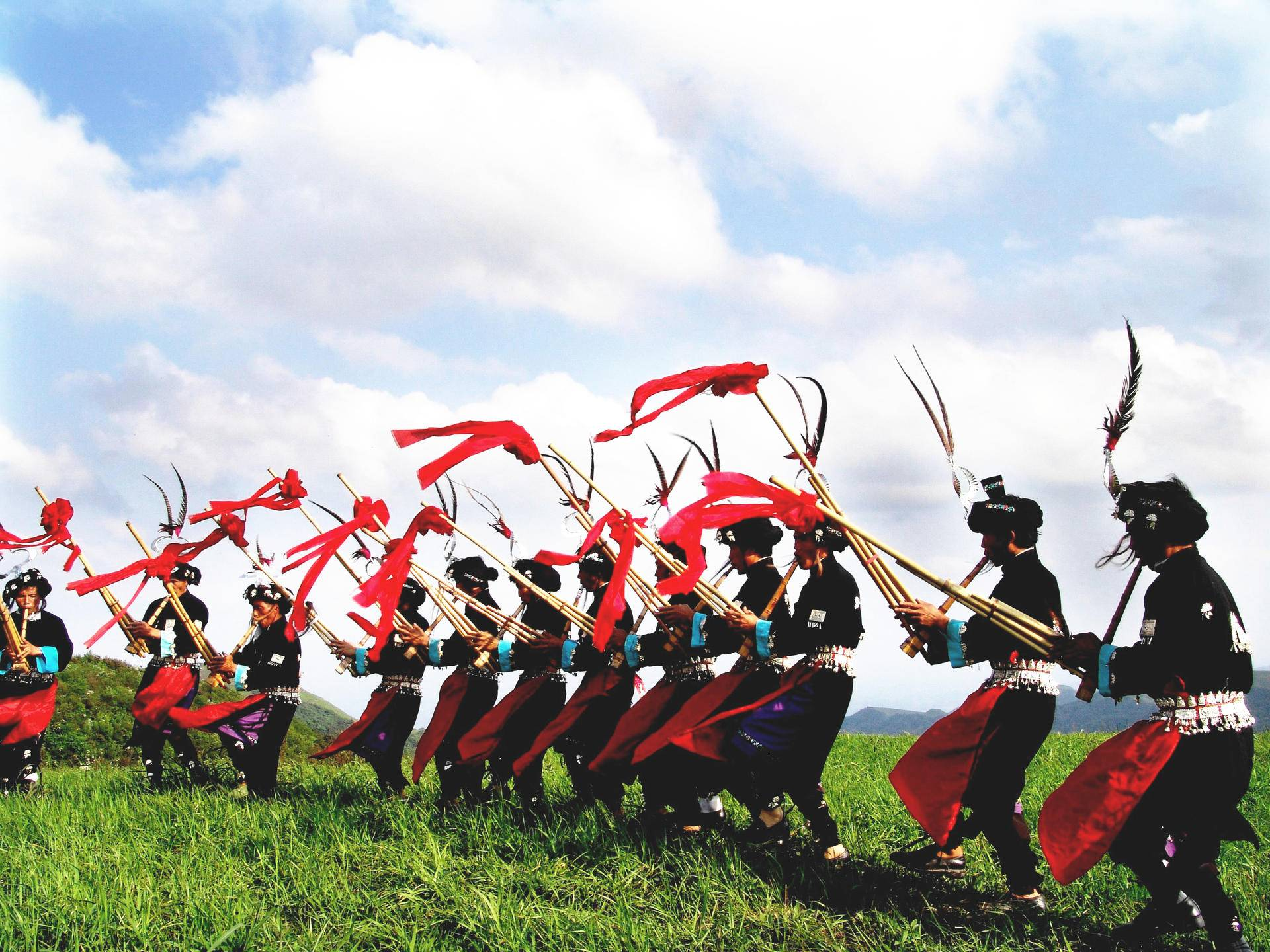 芦笙舞,又名“踩芦笙”“踩歌堂”等,因用芦笙为舞蹈伴奏和自吹自舞而得名,2006年被列入国家级非物质文化遗产名录。它分布于贵州、广西、湖南、云南等地的苗、侗、布依、水、仡佬、壮、瑶等民族聚居区,是南方少数民族最喜爱、分布最广泛的一种民间舞蹈。