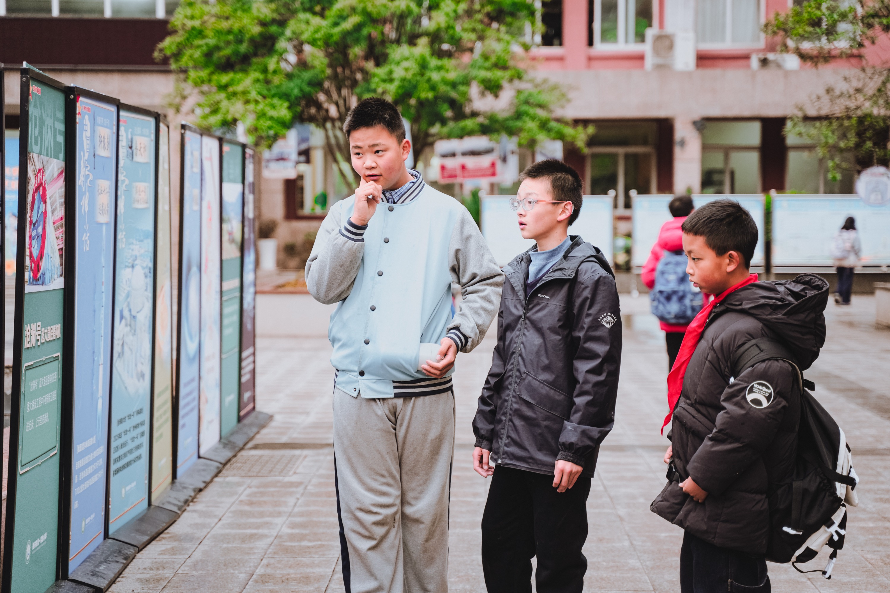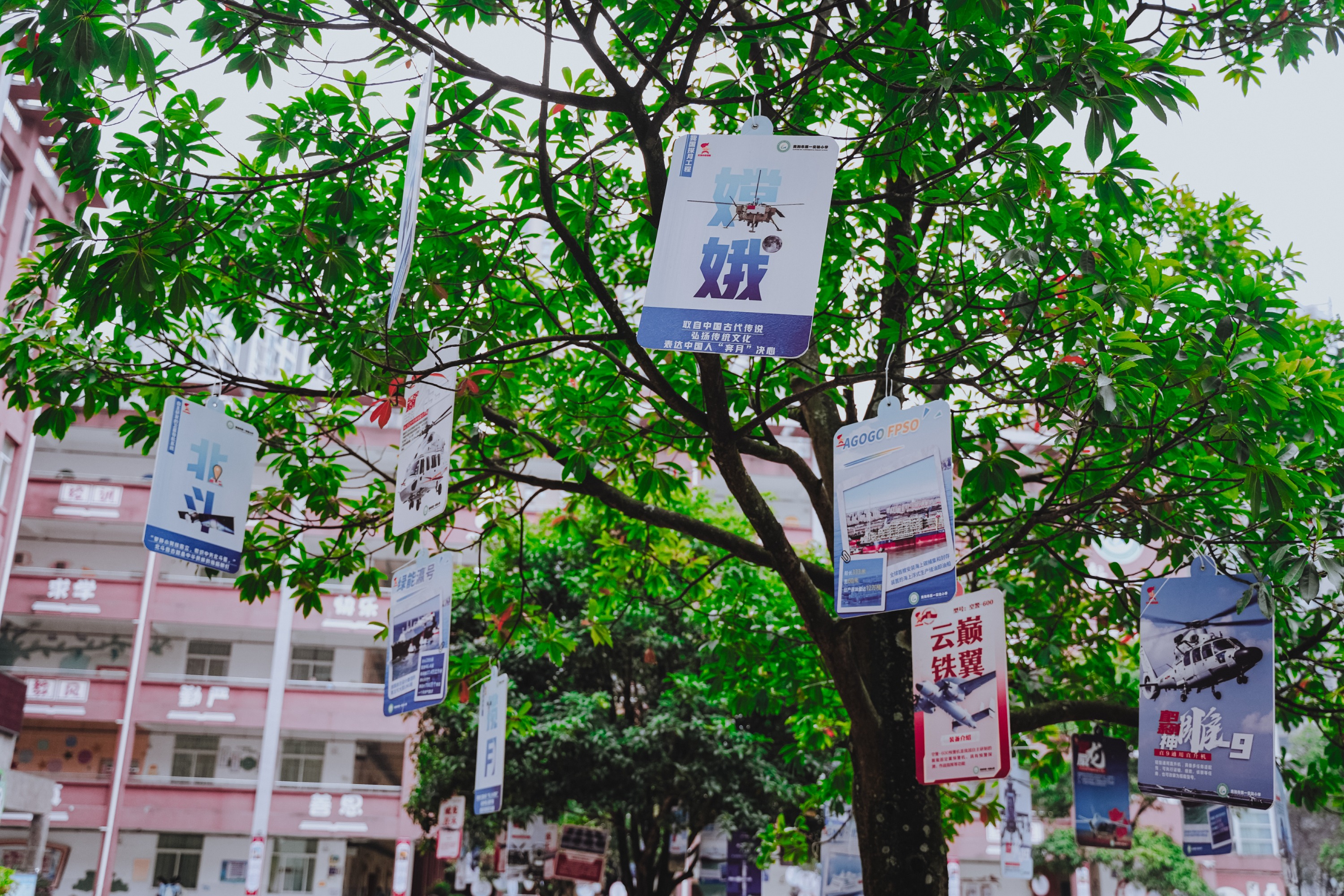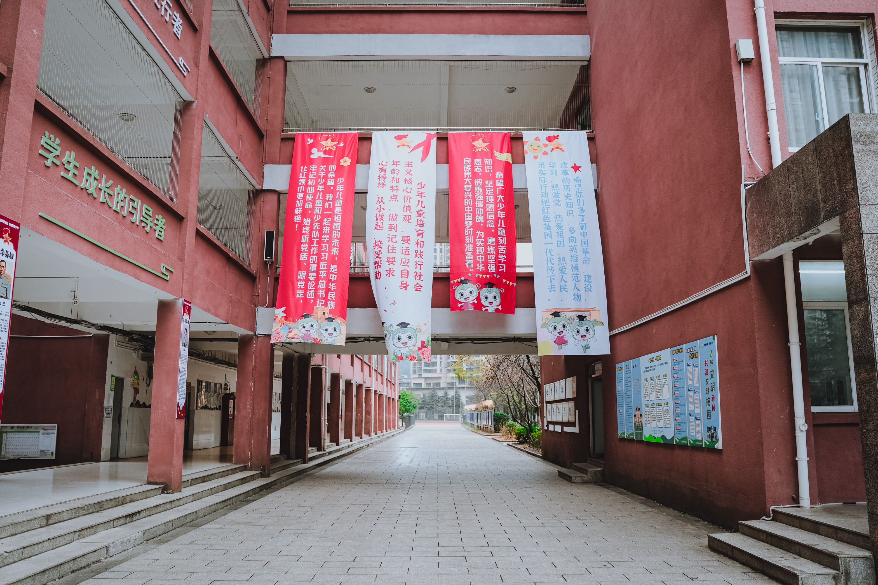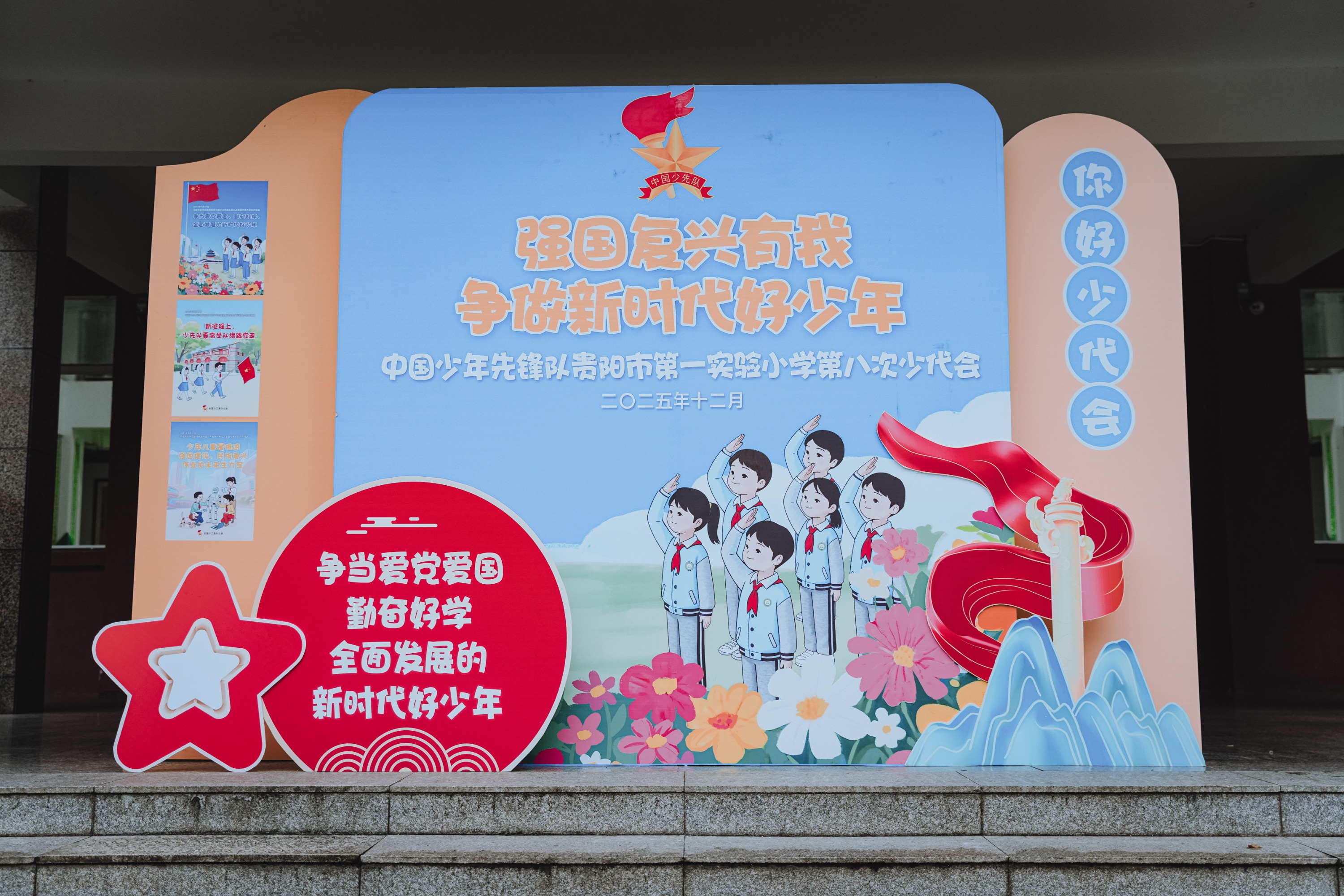 校园内处处洋溢着喜迎少代会的热烈氛围:树上悬挂着以“红领巾爱祖国——大国重器”为主题的玉兔、揽月、嫦娥、梦舟等航空航天科普卡片;楼道间展示的“红领巾与革命英雄时空对话”作品为队员们种下了传承红色基因的种子;各类强国科技知识展板整齐排列供少先队员们参观学习;喜迎少代会的标识与习爷爷寄语横幅迎风招展,字里行间满是习近平总书记对少先队员的殷切寄语,为大会增添了浓厚的红色氛围。