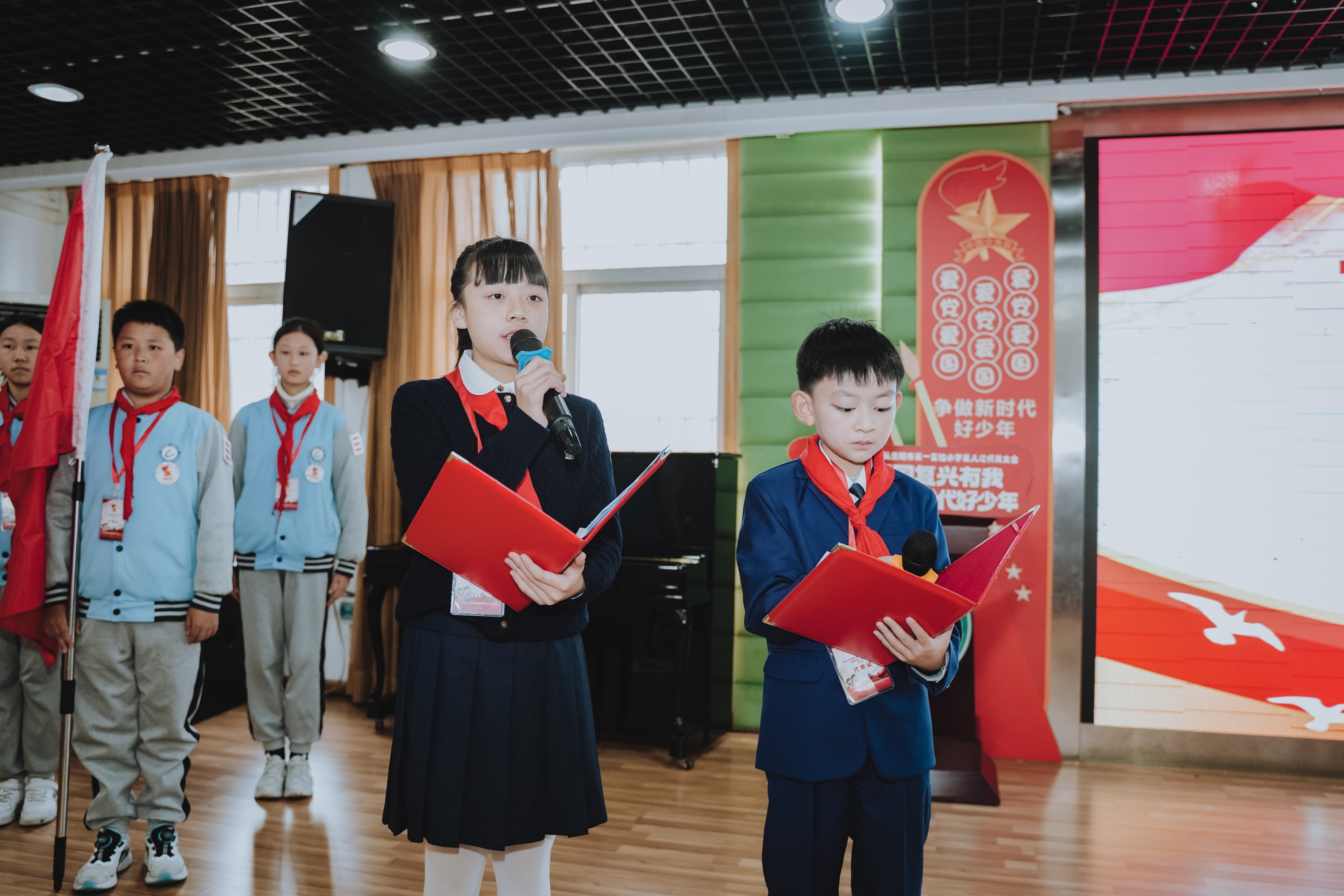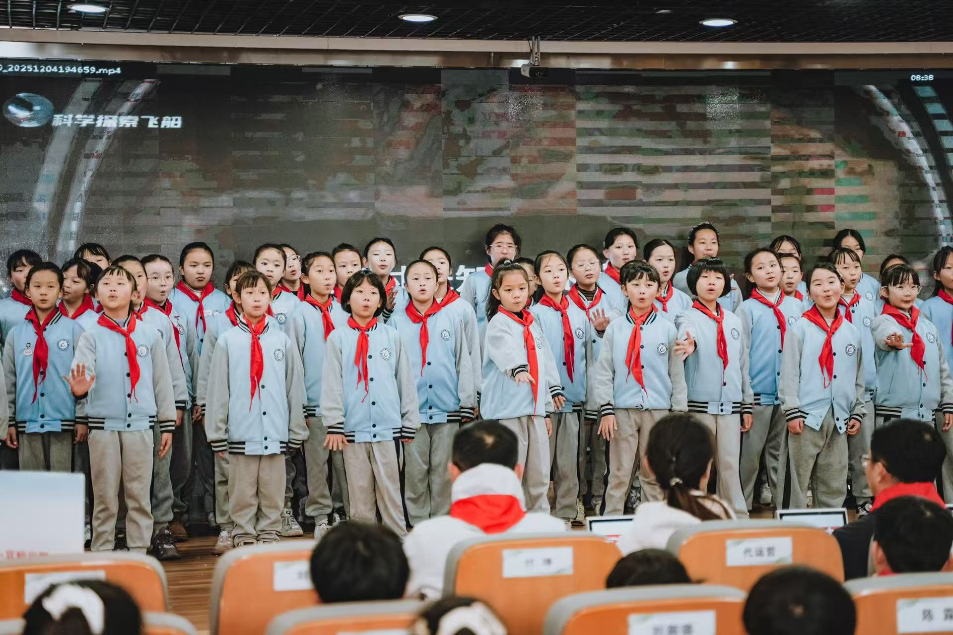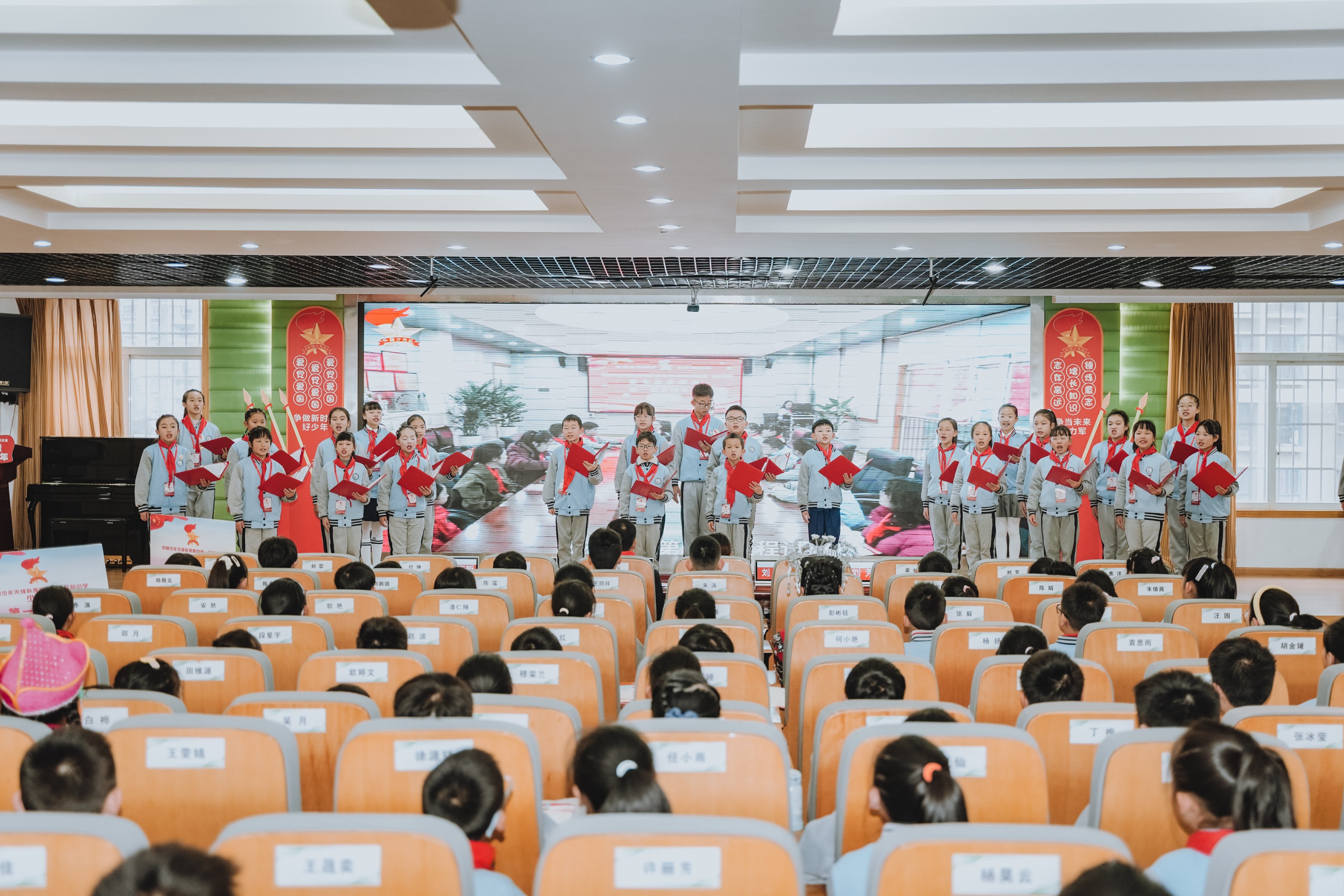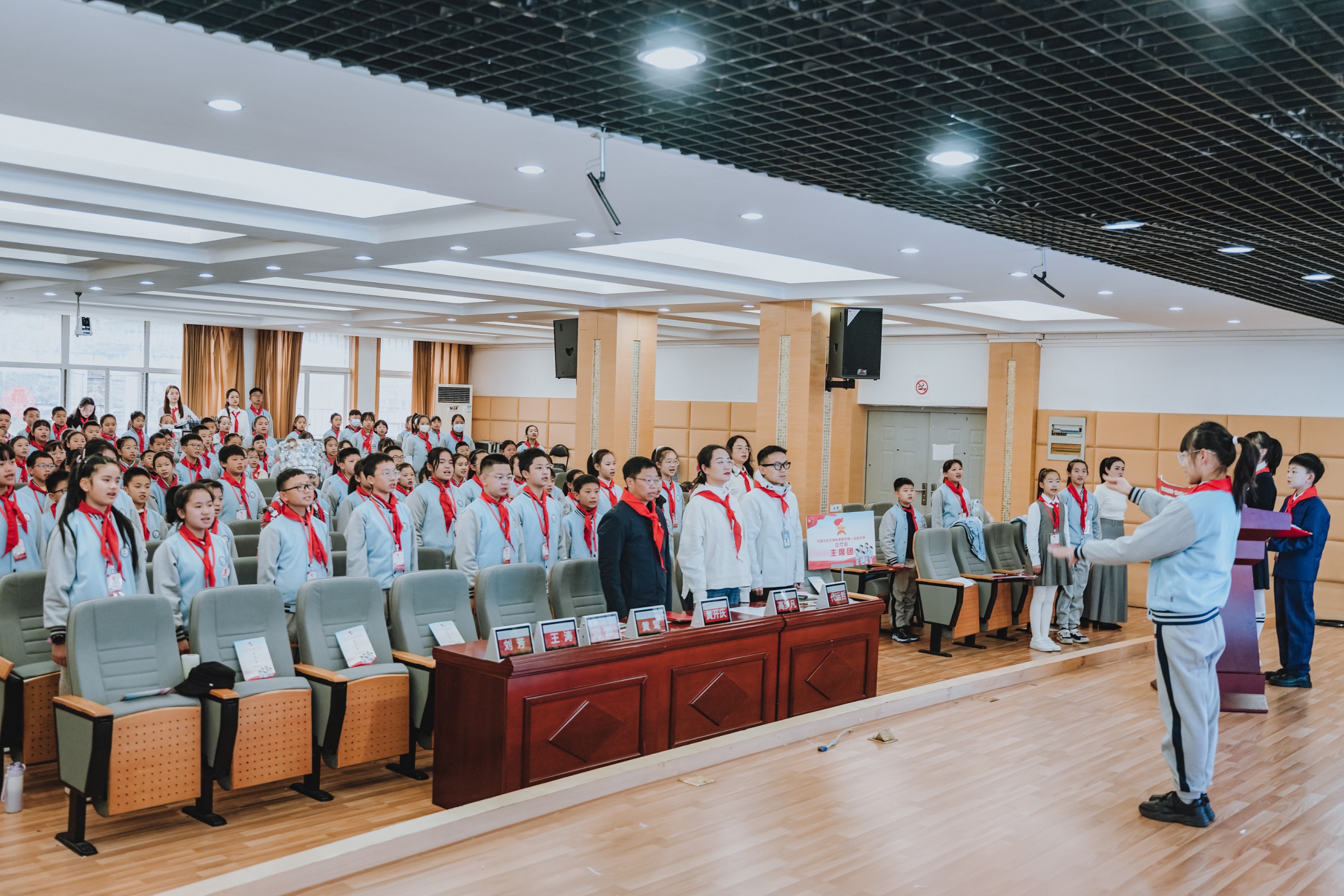 大会在庄严的氛围中拉开序幕。首先,少先队员代表为出席大会的学校领导佩戴上鲜艳的红领巾,一张张稚嫩的脸庞洋溢着自豪与崇敬。随后,学校合唱团的队员们带来了充满朝气的大合唱《璀璨冒险人》,用嘹亮的歌声展现了新时代少年的蓬勃风采。