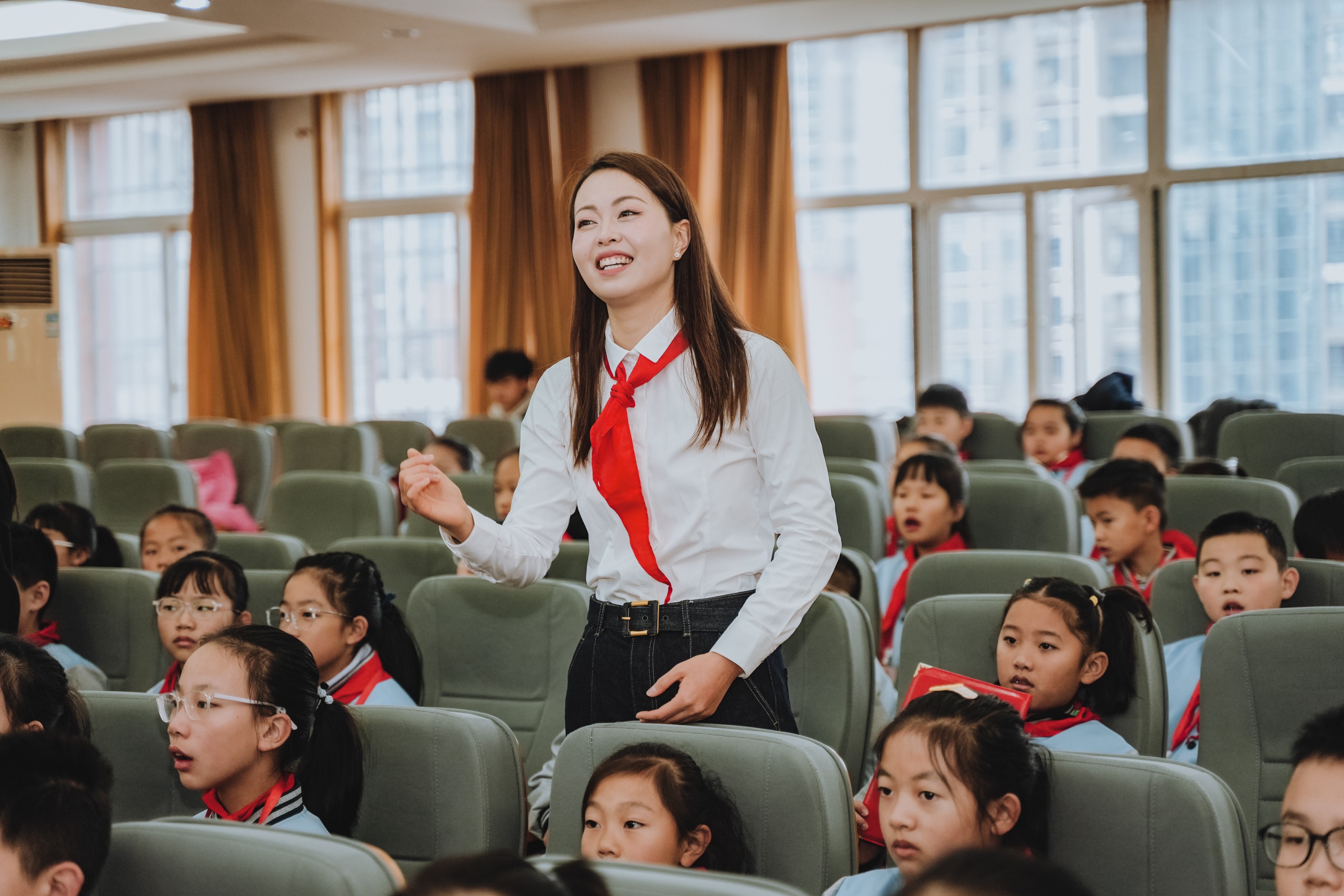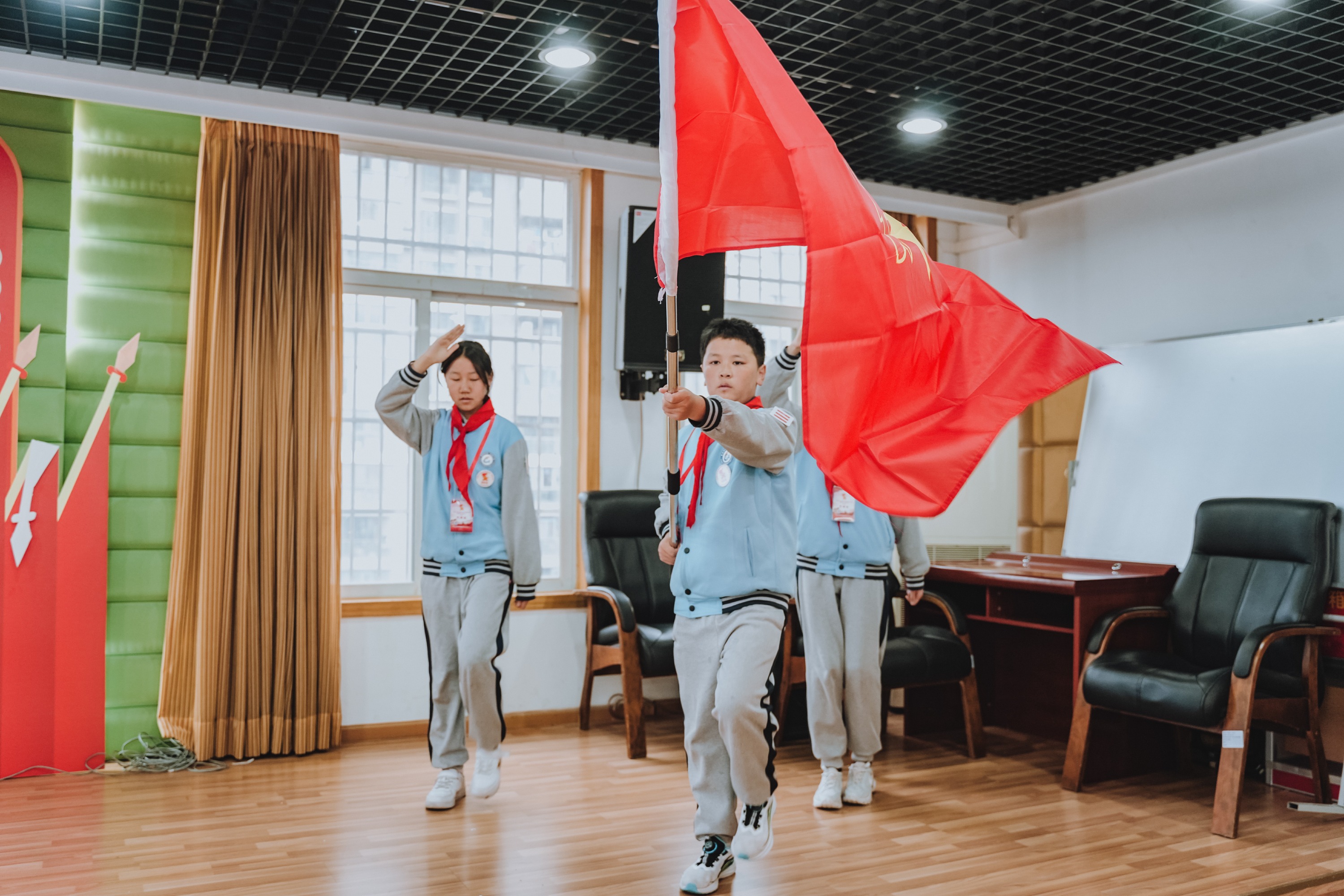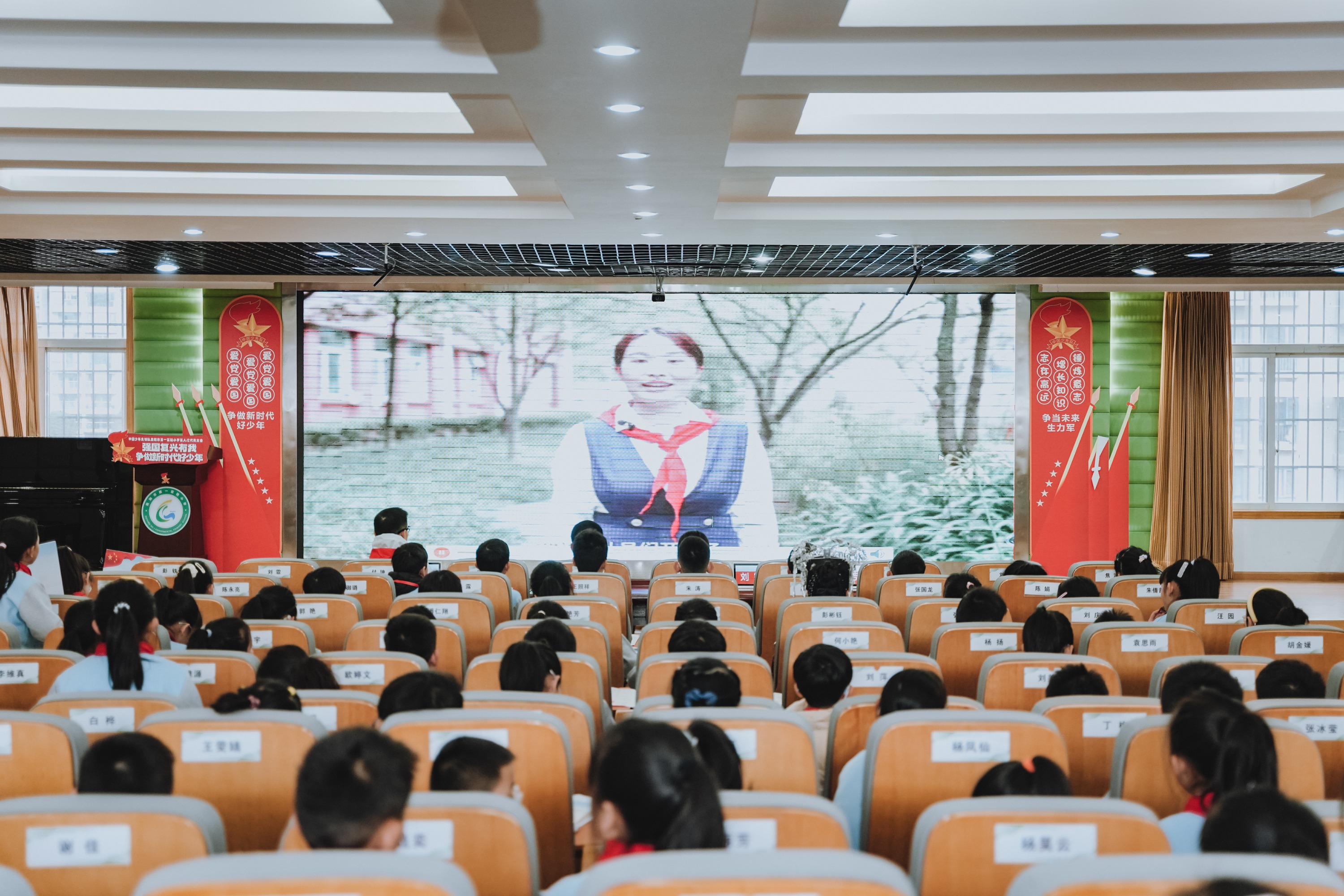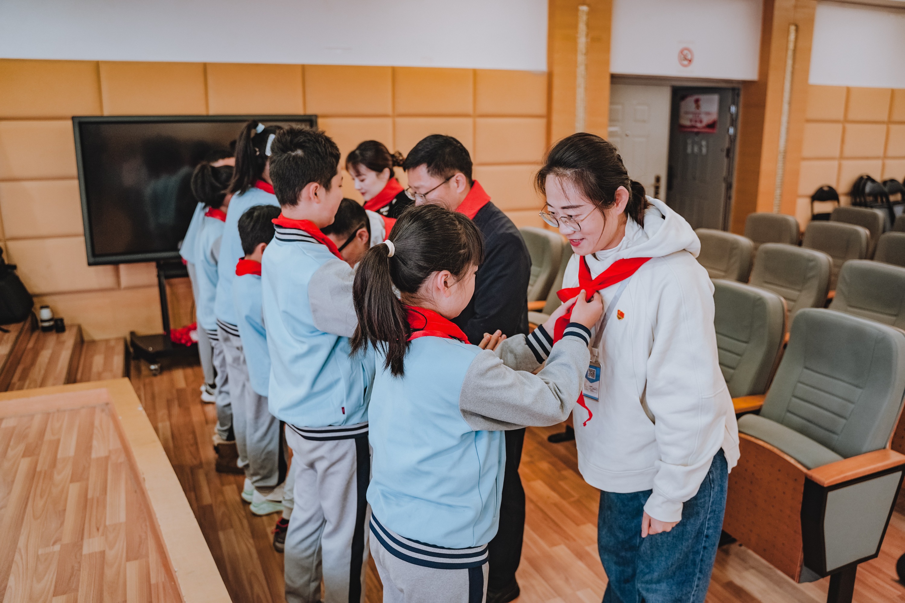 大会在庄严的氛围中拉开序幕。首先,少先队员代表为出席大会的学校领导佩戴上鲜艳的红领巾,一张张稚嫩的脸庞洋溢着自豪与崇敬。随后,学校合唱团的队员们带来了充满朝气的大合唱《璀璨冒险人》,用嘹亮的歌声展现了新时代少年的蓬勃风采。