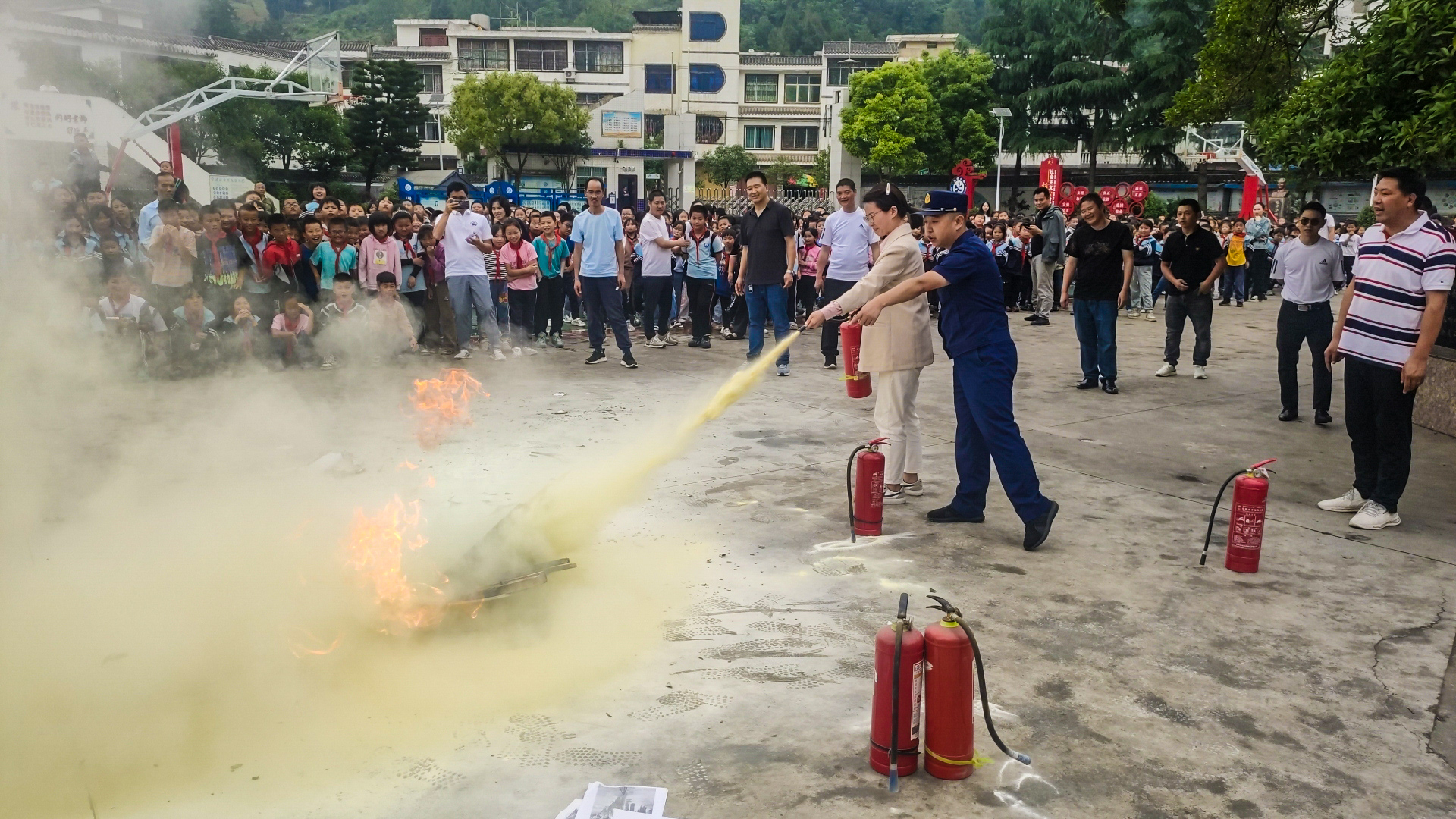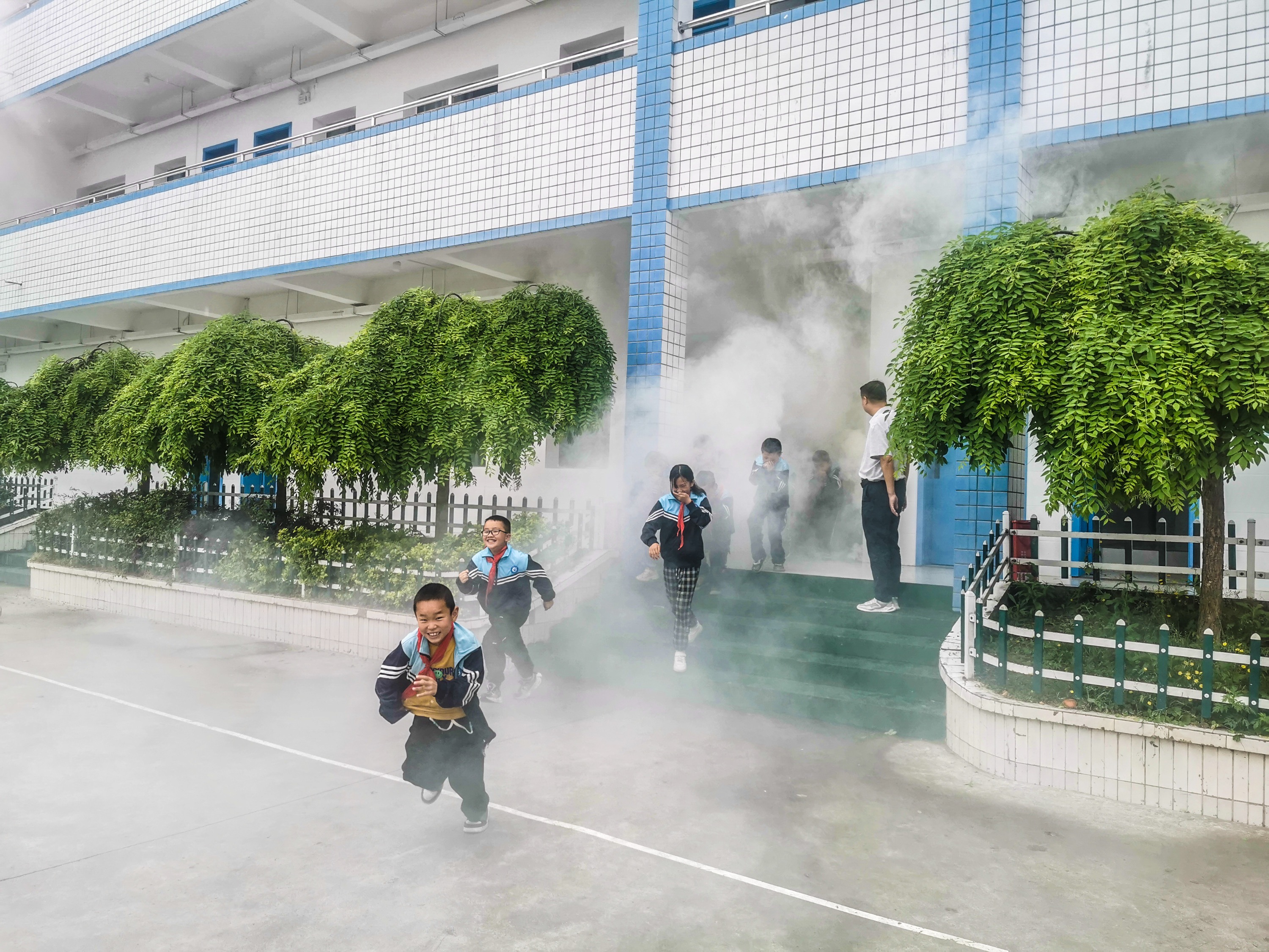 下午13时50分,伴随急促消防警报声,1000余名师生手捂口鼻、弯腰低头,井然有序地穿过浓烟密布的教学楼,迅速逃离到学校安全区域。随即,消防大队宣传员通过讲解如何正确逃生、如何正确拨打电话等一懂三会的消防知识,向全校师生进行培训。期间,宣传人员还邀请部分师生,上场参与如何正确使用灭火器扑救火灾等。