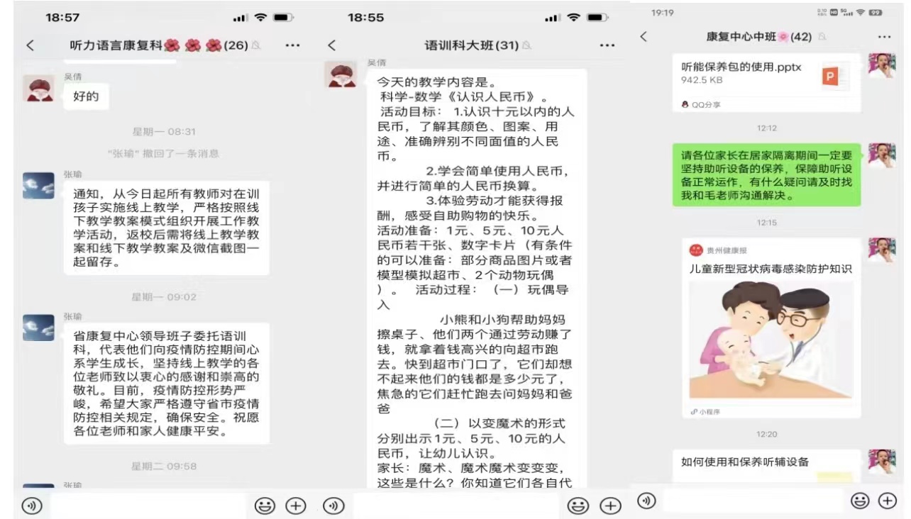 语训科全体教师通过班级微信群等方式,集体课教学老师、个别化教学老师以及听力师共同开展线上教学,以班级和聋儿家庭为单位,保证所有在训听力障碍儿童“停课不停教,停课不停学”。