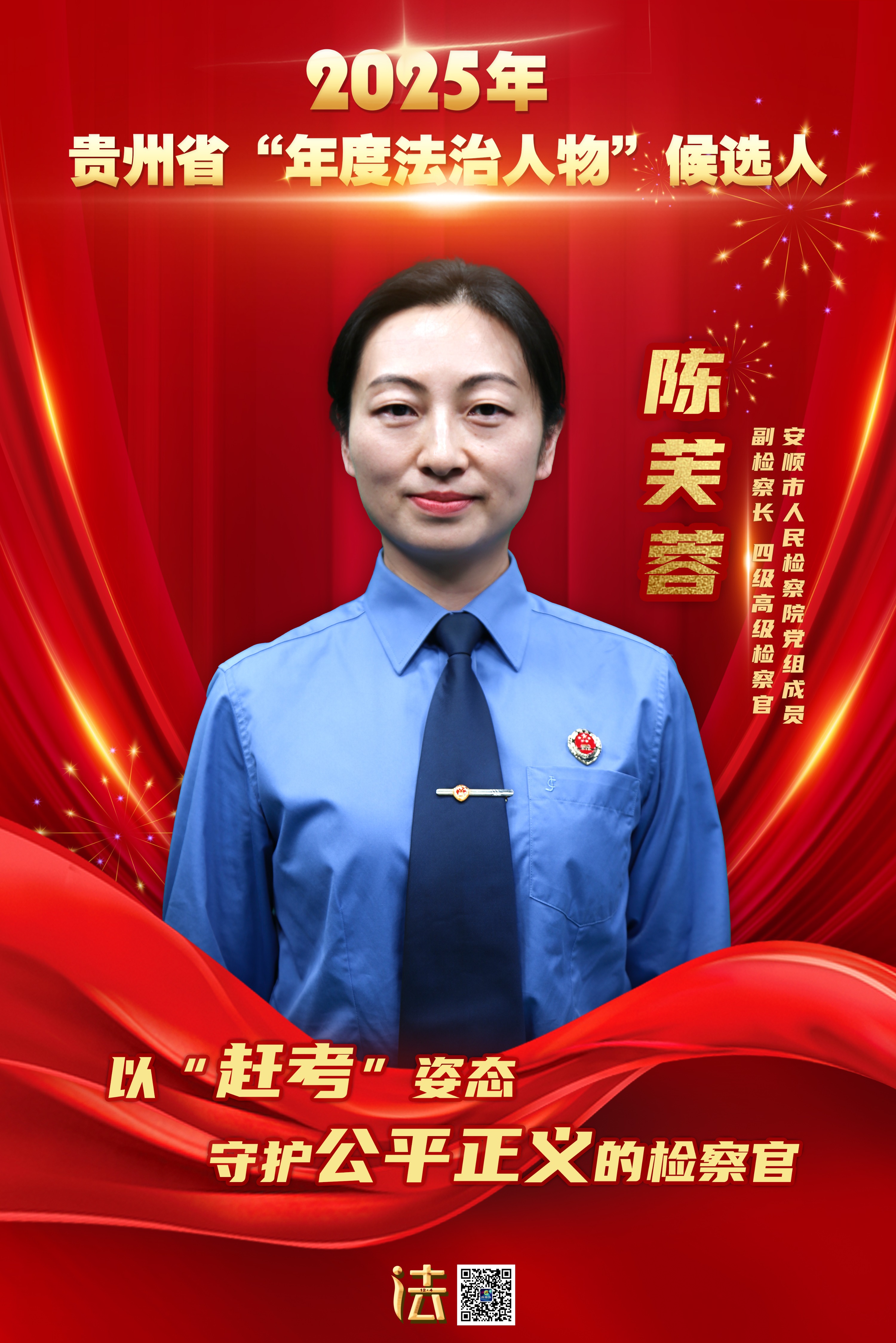 陈芙蓉,安顺市人民检察院党组成员、副检察长、四级高级检察官,先后荣获“全国模范检察官”“全国先进工作者”等荣誉。她坚守公诉一线二十九年,累计参与办理、指导各类刑事案件2000余件,用专业与坚韧诠释着“案件质量是生命线”的职业信念。在新时代法治建设的征程中,书写了一名人民检察官的深情答卷。