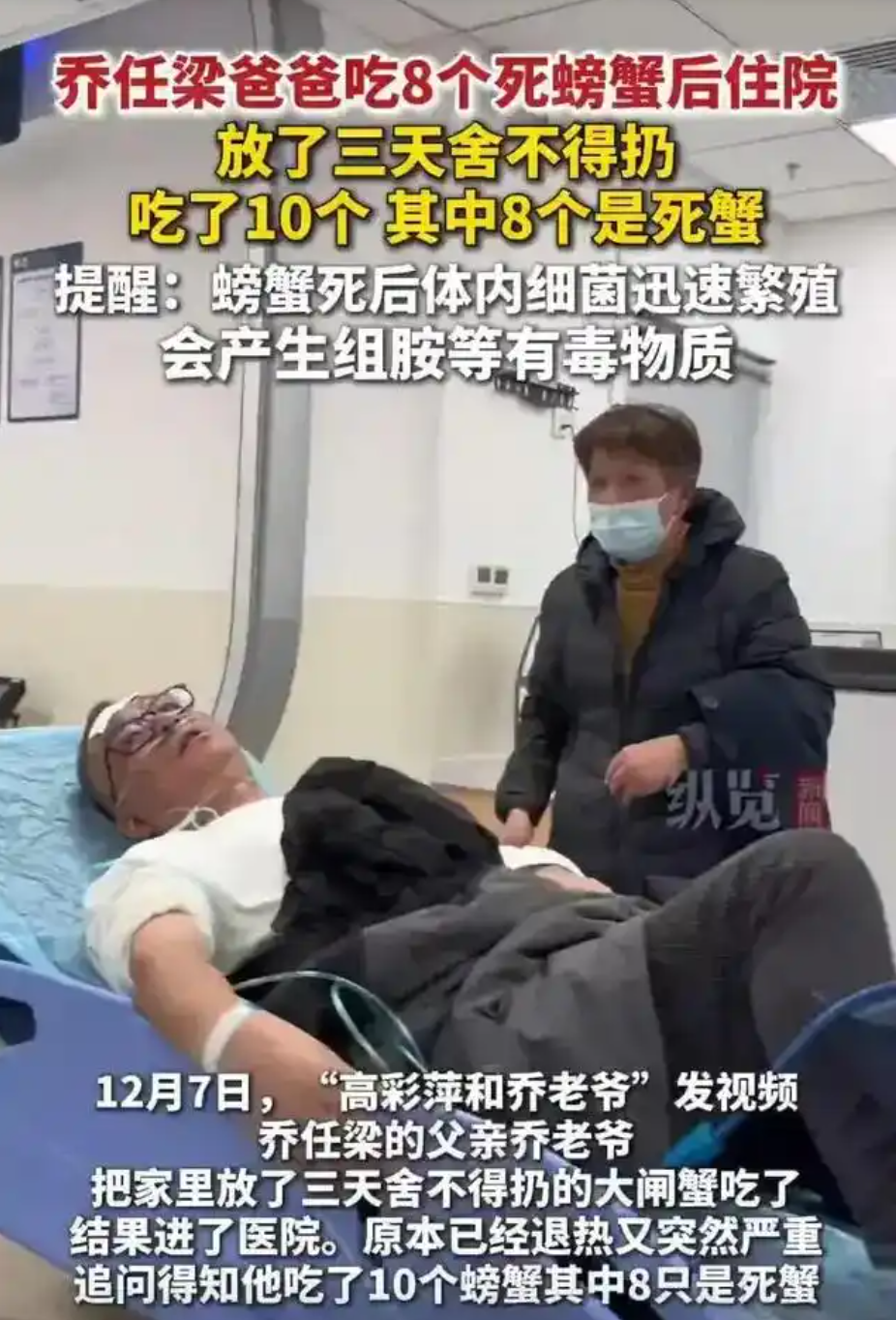 据报道,乔爸爸在食用螃蟹后,很快出现严重不适。其本人康复后在视频中坦言,自己吃的螃蟹“不太新鲜”,推测可能是死蟹。他表示,当时症状严重,“上吐下泻,整个人非常难受”,被紧急送医后情况危急,甚至需要进入ICU观察治疗。这绝非普通的“吃坏肚子”,而是一次典型的严重食物中毒事件。一只死蟹的威力为何如此之大?对此,动静记者采访了贵阳市第二人民医院急诊科副主任、副主任医师谢巍。