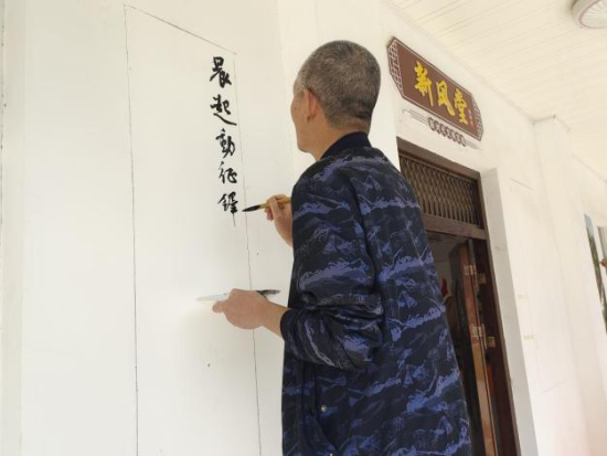 “晨起动征铎,客行悲故乡……”5月23日,安徽省旌德县旌阳镇板桥村新风堂门口,丁仗荣站在板凳上,左手拿着墨碟,右手举着毛笔,微仰着头,正在往新风堂的白墙上书写温庭筠的《商山早行》。村部三三两两地聚集了很多围观的村民,凑近仔细一看,《商山早行》的第二句“鸡声茅店月,人迹板桥霜。”的“板桥”二字隐匿其中,像是丁仗荣为日后每一位经过新风堂的村民们埋下的一个文化“小彩蛋”。