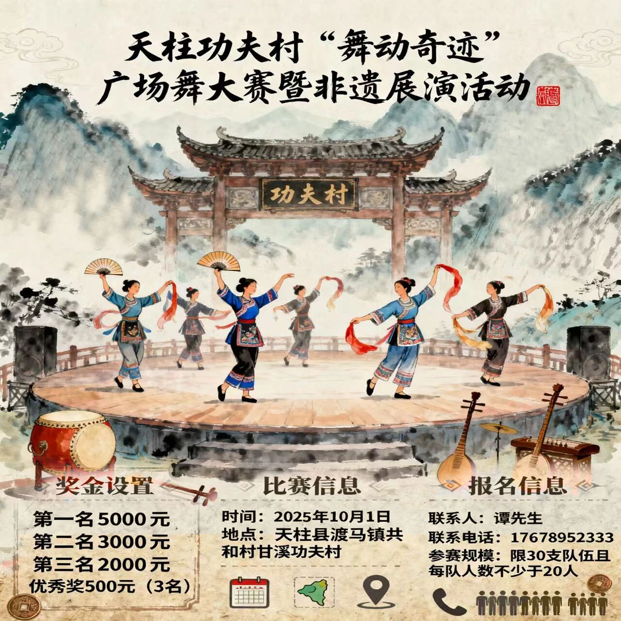 10月1日(农历八月初十),渡马镇功夫村文化广场将重磅开启“舞动奇迹”广场舞大赛暨非遗展演活动,一场属于热爱与传承的狂欢,等你来打卡!
