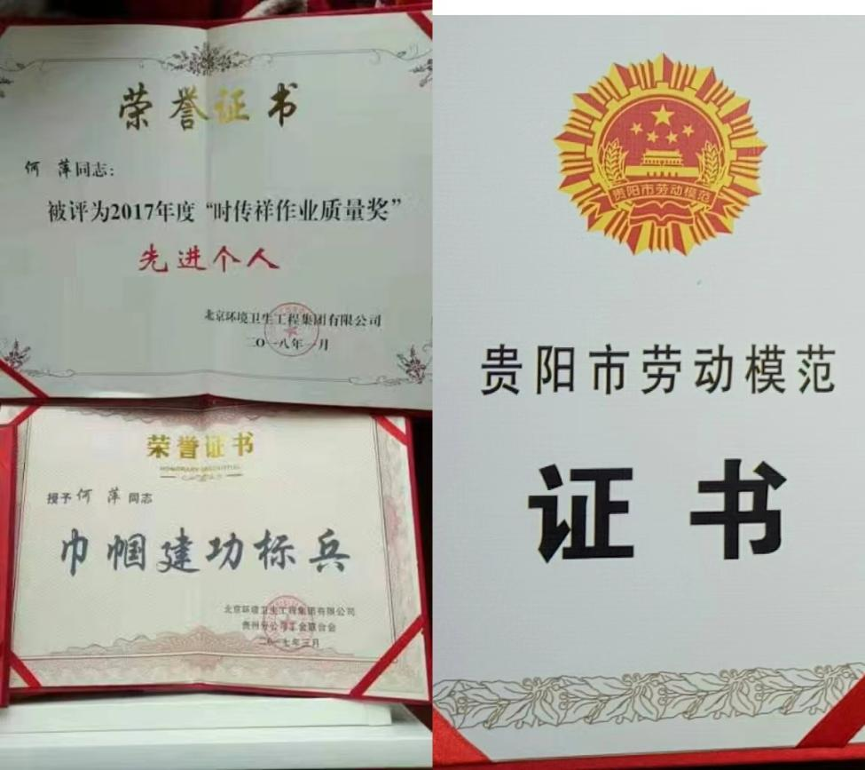 在不断的奋斗和努力下,何萍的环卫工作和团队管理能力都得到了贵阳市、区及所在公司的肯定,因此,2016年6月,何萍被授予了“贵阳市劳动模范”荣誉称号。