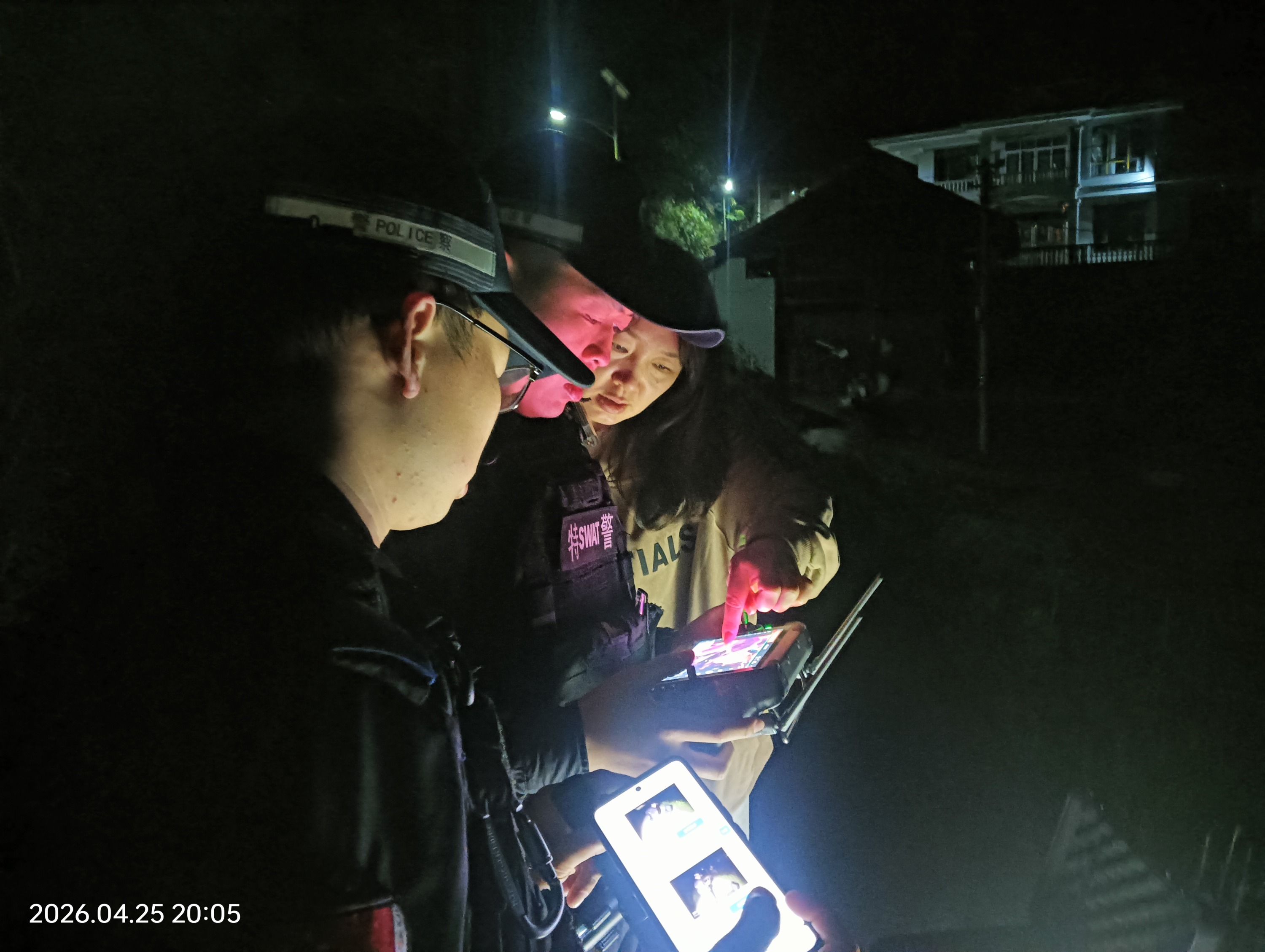 救援中,特巡大队队员迅速操控无人机升空,凭借高空优势,对大面积山林区域进行全方位扫描,重点排查植被茂密、地形复杂的隐蔽地段,实时向地面搜救组传递高空视野和热源线索。