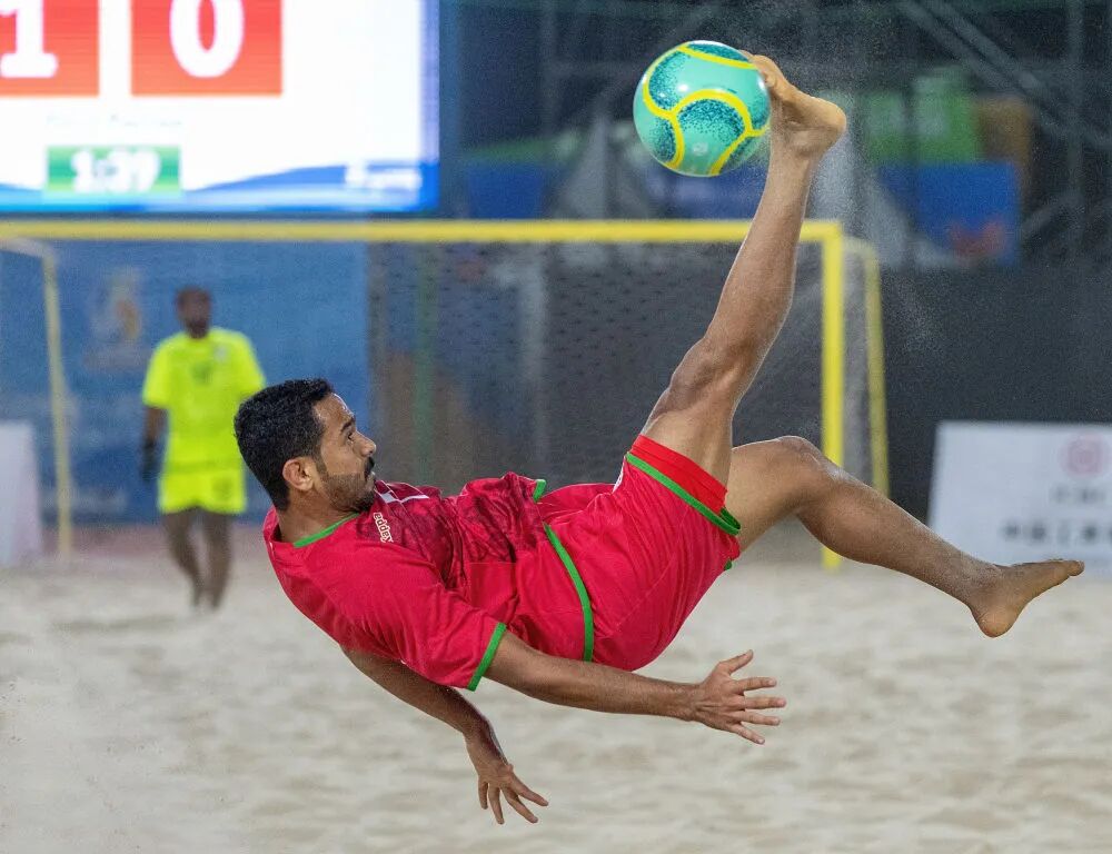 4月23日,阿曼队球员在亚沙会沙滩足球比赛中射门。新华社记者 胡竞文 摄