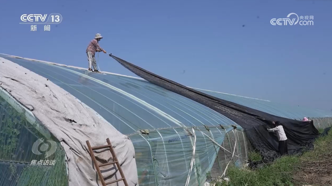 8月30日,在河南漯河一家种植合作社,蔬菜种植大户曹明明正和工人一起给大棚幼苗期的西红柿加装遮阳网降温。曹明明种植大棚蔬菜300多亩,受7月暴雨影响,棚内辣椒未能及时采摘上市,在当地农业部门的指导下,曹明明开始种植西红柿,预计10月中旬就能上市。同时农业部门还派出技术小分队帮助农户补种耐高温速生蔬菜,根据“一棚一策”的方案,曹明明的其他十亩大棚补种了耐高温的有机花菜。