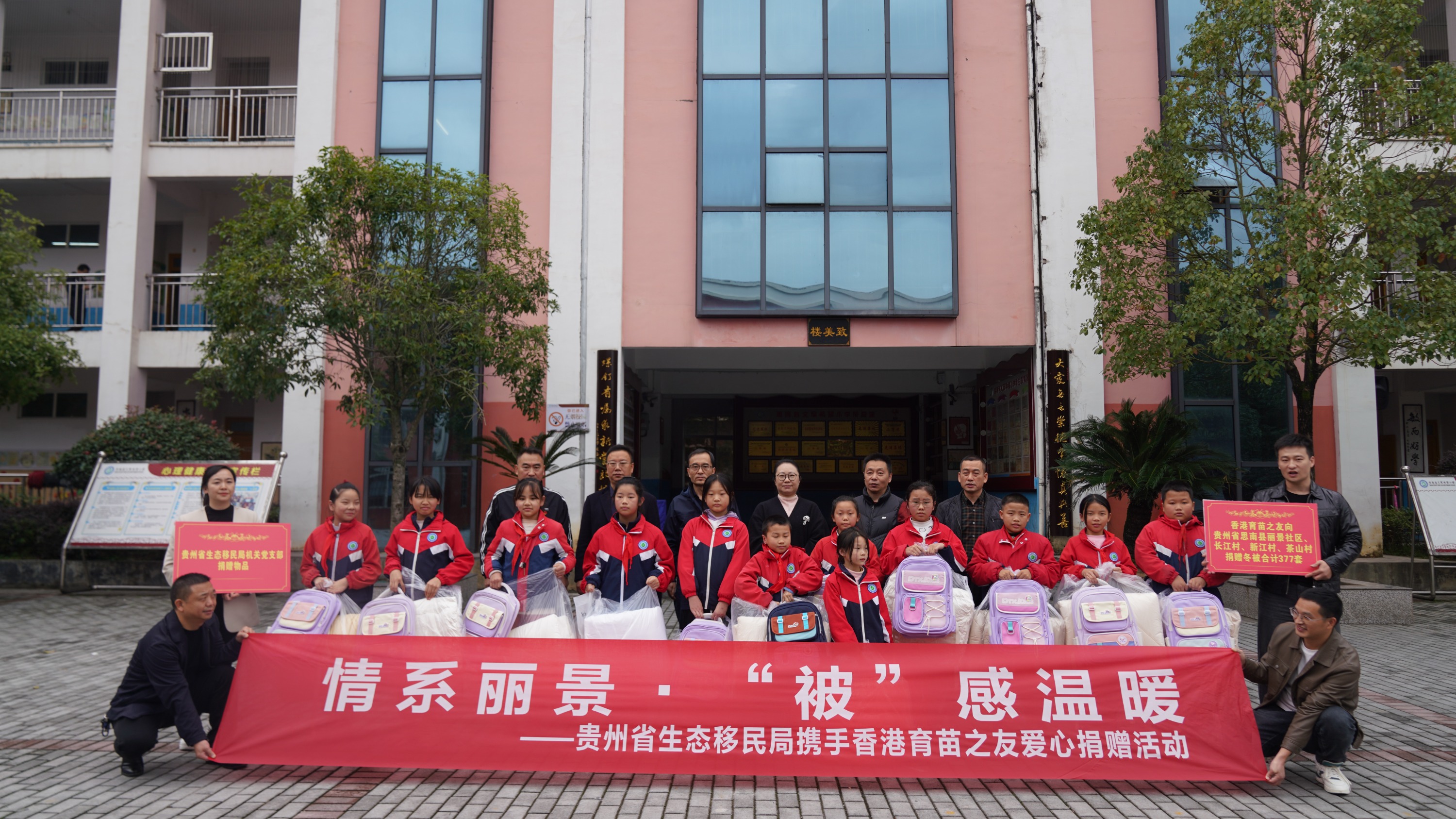 活动当天,省生态移民局代表与香港育苗之友爱心企业代表首先来到思南县文军希望小学,向该校的10余名学生捐赠了书包、棉被。