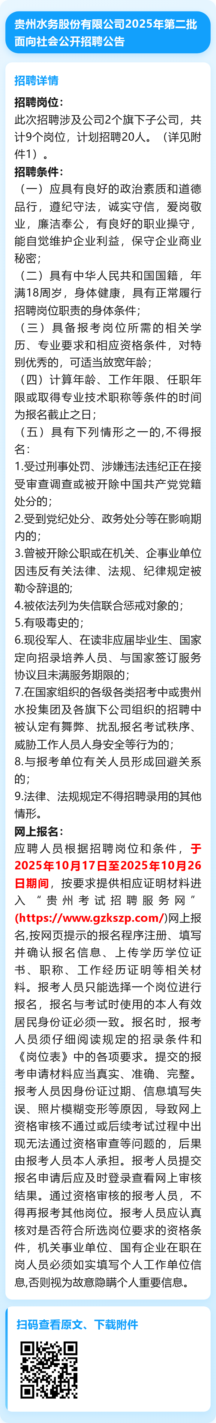 【国企】贵州水务股份有限公司招聘!报名截止时间:2025年10月26日!