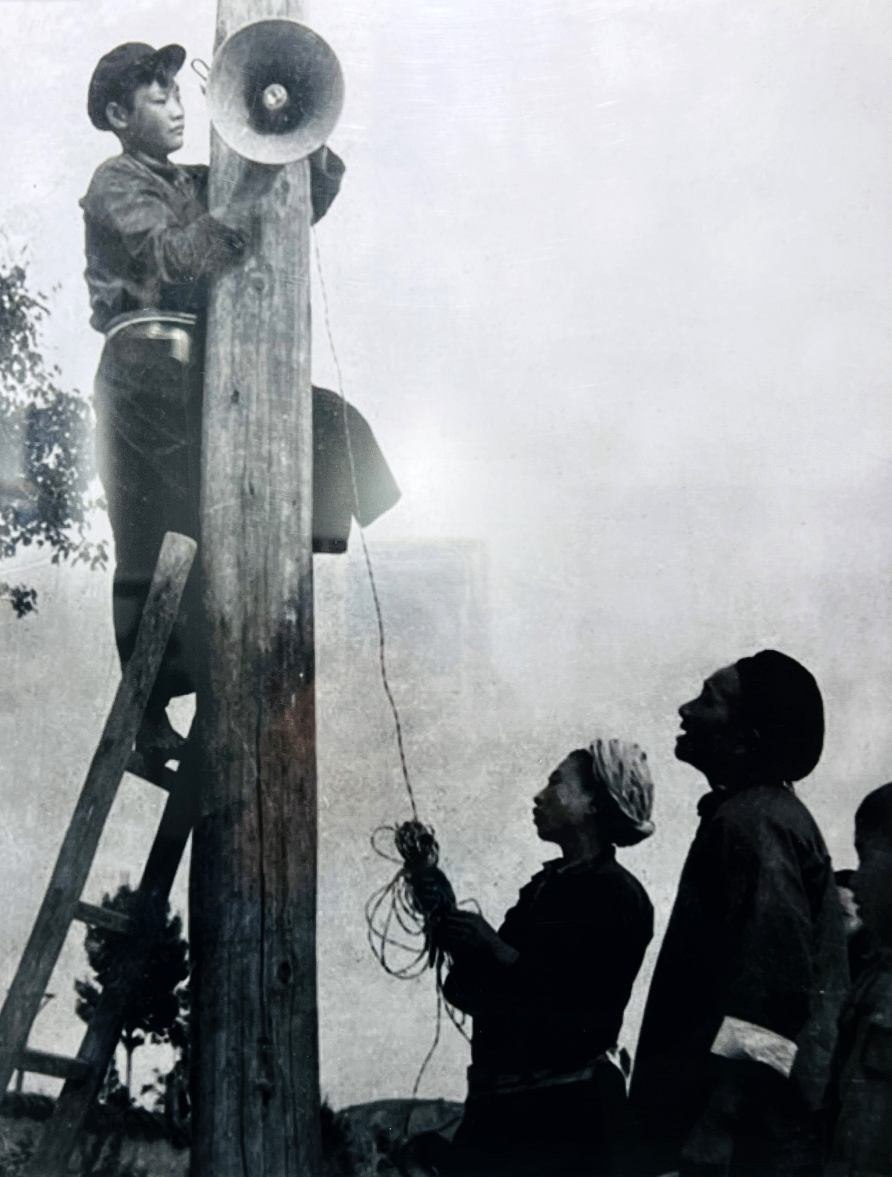 贵州人民广播电台建台之初 技术人员在乡村架设高音喇叭