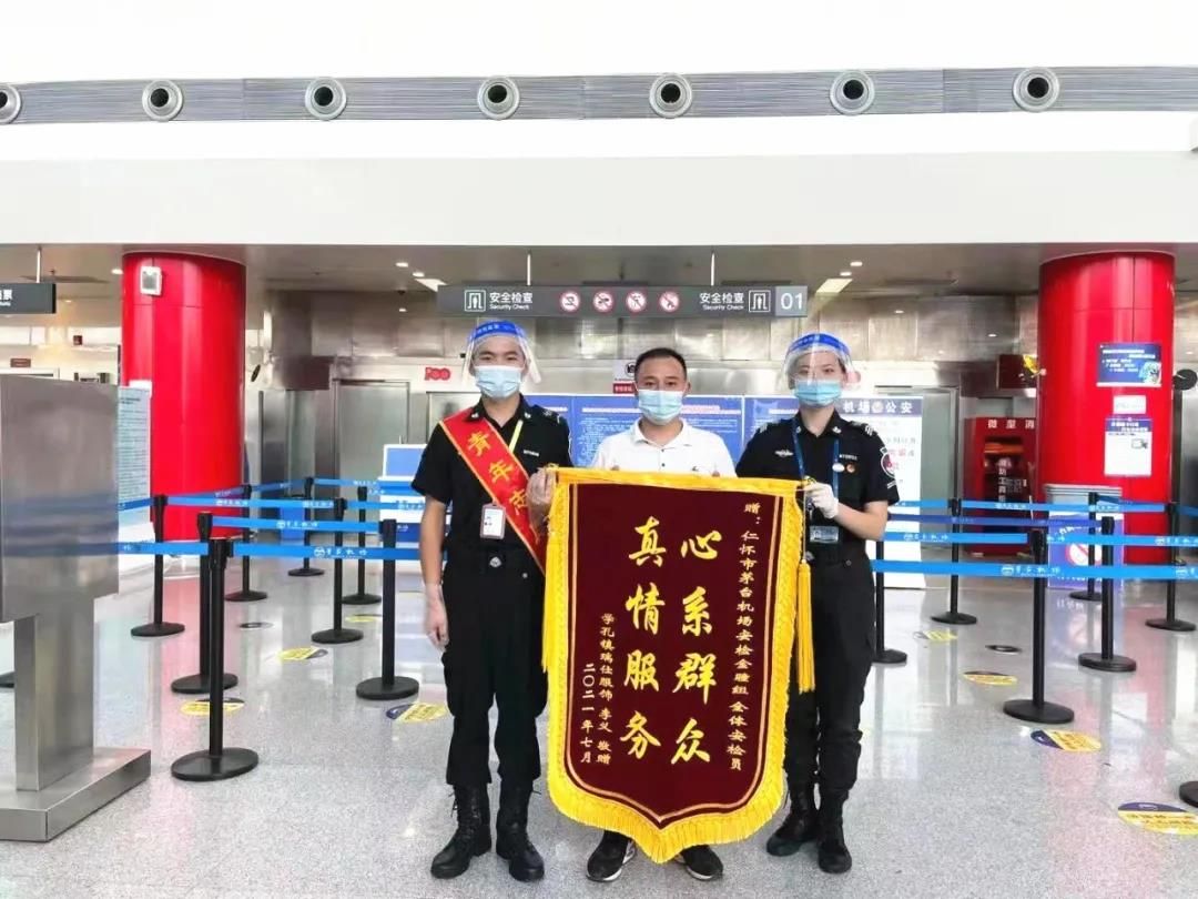 ▲近日,一位旅客将一面写着“真情服务,心系群众”的锦旗送到遵义茅台机场安全检查部金瞳班组的手中,对金瞳班组尽职尽责、高效办事、热情周到的服务提出高度赞扬和诚挚感谢。