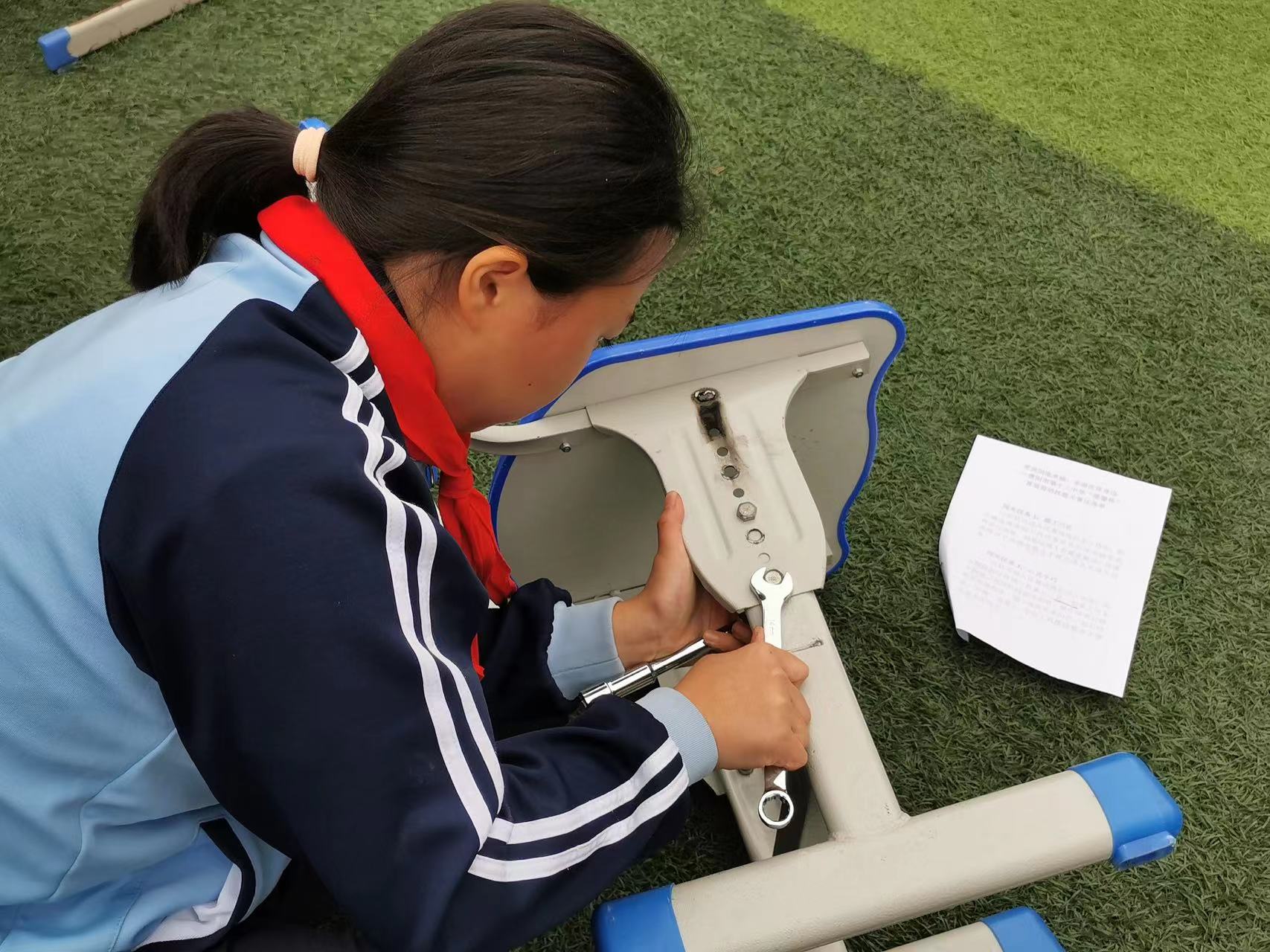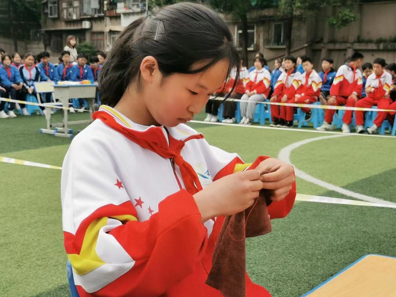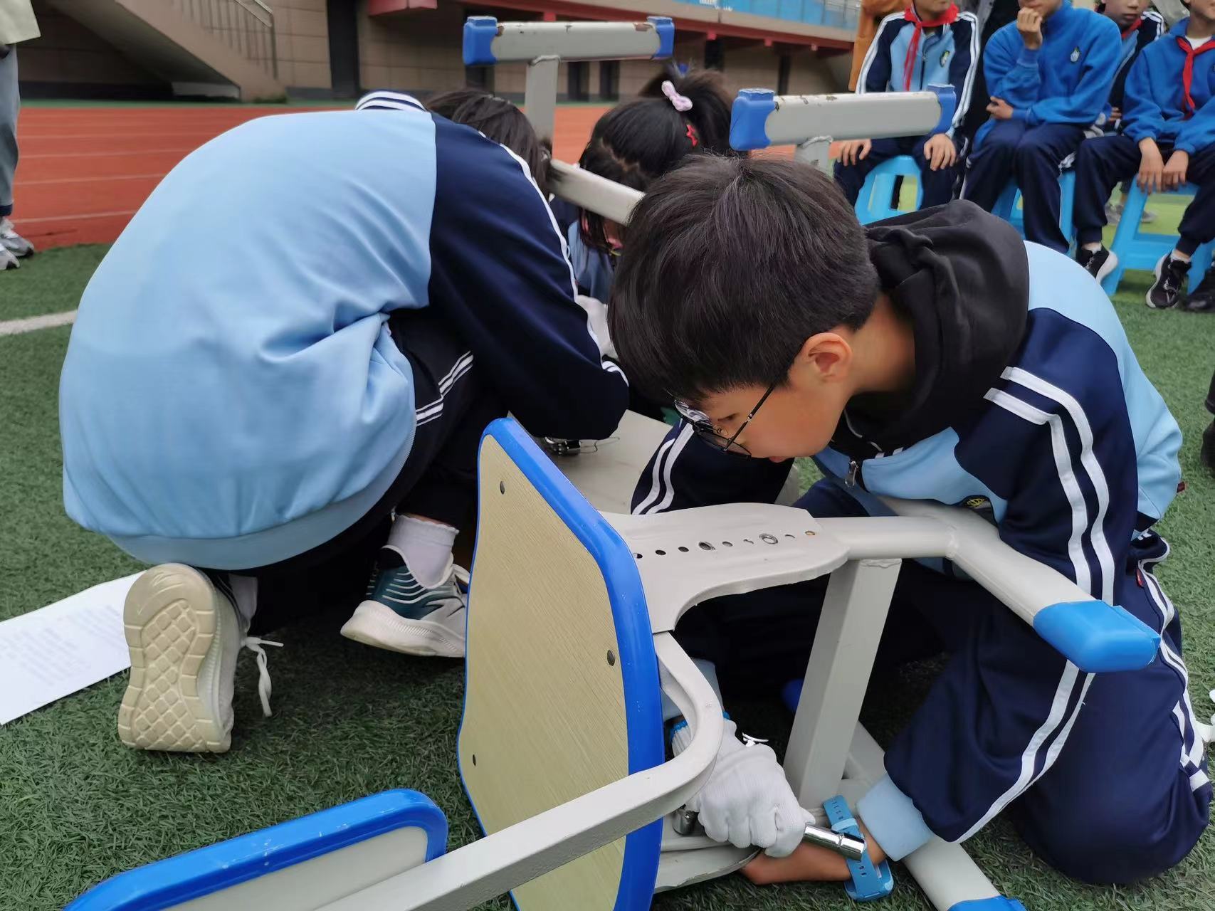 活动赛事分别为“能工巧匠”“心灵手巧”两项闯关任务。“能工巧匠”的学生熟练组装课桌椅,“心灵手巧”的学生分工协作,耐心将纽扣缝在布条上。