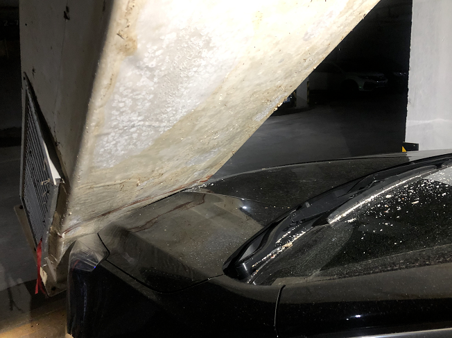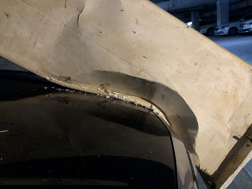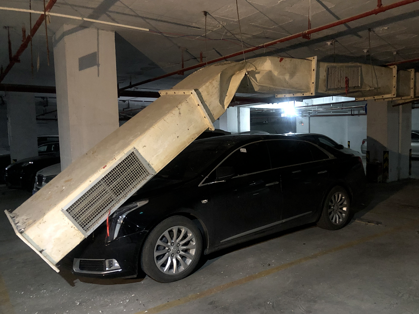 11月21号,记者来到现场时,田先生的车仍然停在停车场里。可以看到,停车场里的通风管道有一截脱落下来,重重地砸在了车辆的引擎盖上,“主要是车头的位置受损。具体的情况还没看到,因为这个管子我抬不动。”