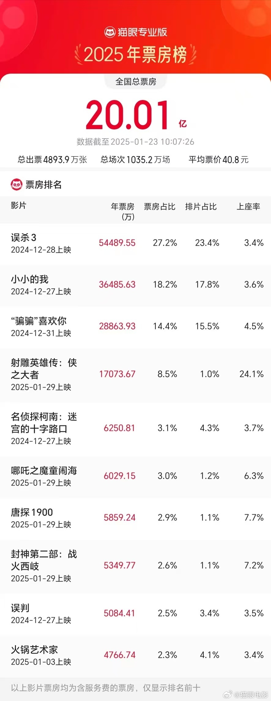 据猫眼专业版数据,2025年1月23日09时42分,2025年度票房(含预售实时)破20亿。