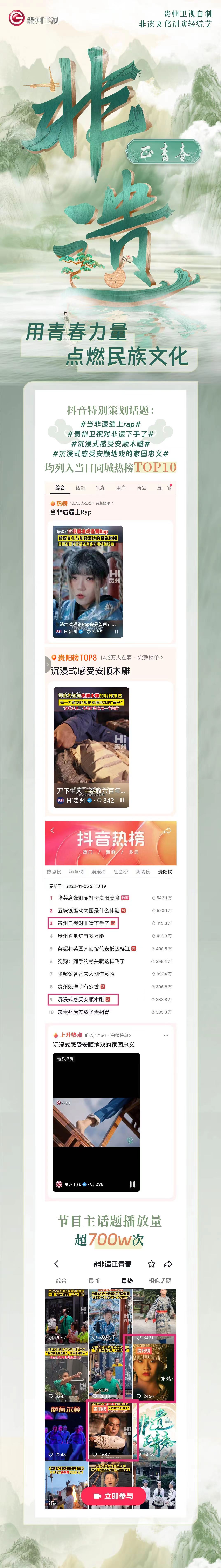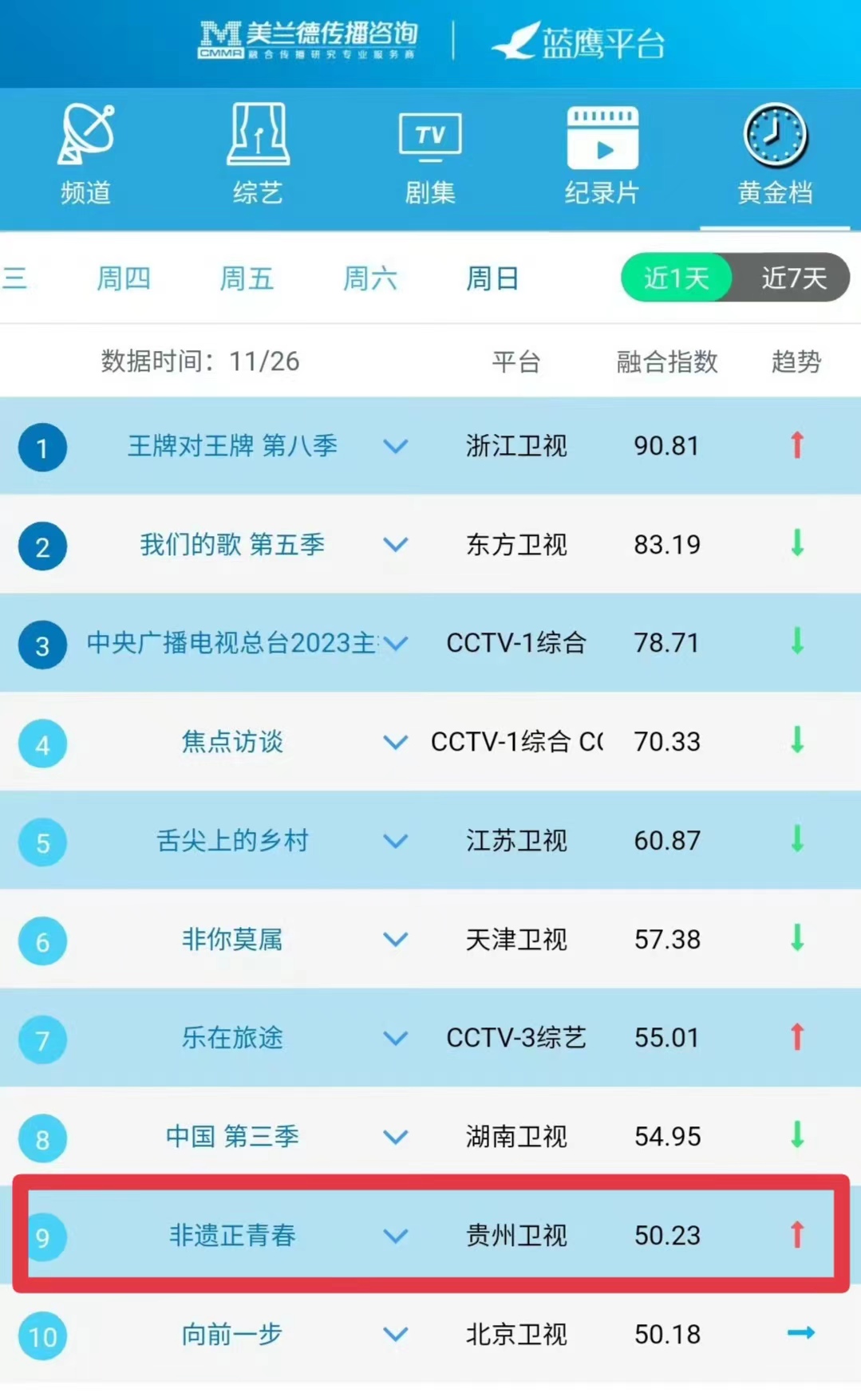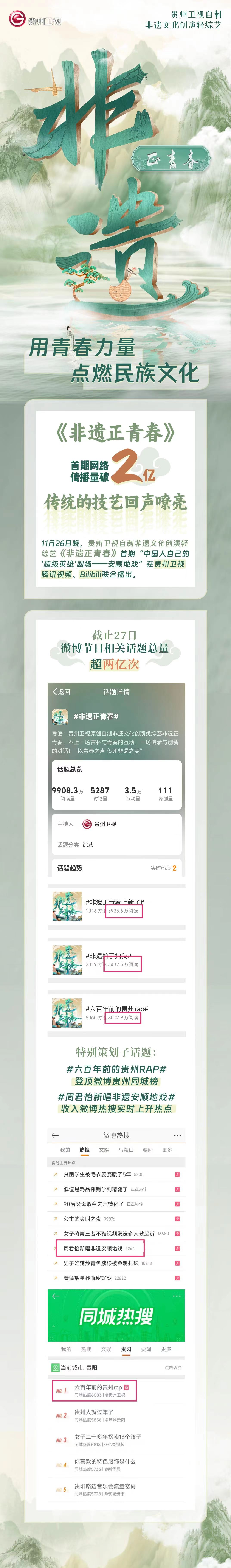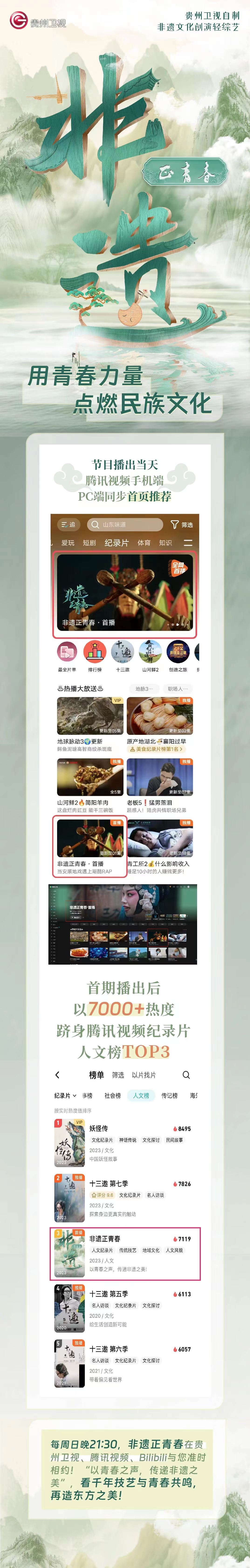 11月26日晚,贵州卫视自制非遗创演轻综艺《非遗正青春》正式上线,腾讯视频、bilibili联合播出。首期“中国人自己的‘超级英雄’剧场——安顺地戏”,播出当日冲上美兰德融合传播指数榜黄金档TOP9。
