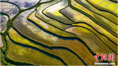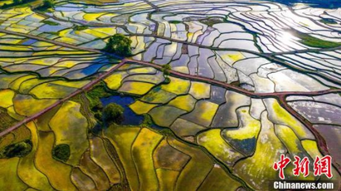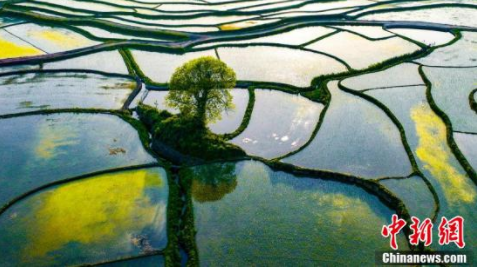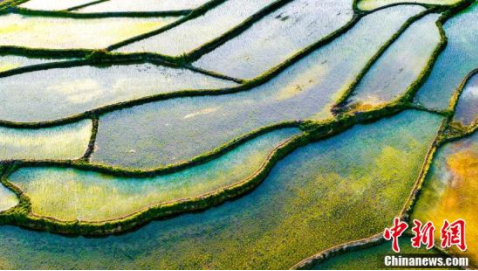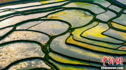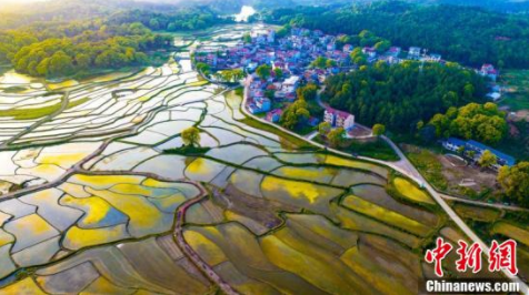 近日,落日时分,航拍江西吉安县大冲乡的壮美梯田,余晖映照在成片的灌水梯田上,熠熠生辉,犹如一块块天然的“调色板”,与行走在田垄上的村民、远处的村庄和青山,共同构成了一幅春日田园画卷。