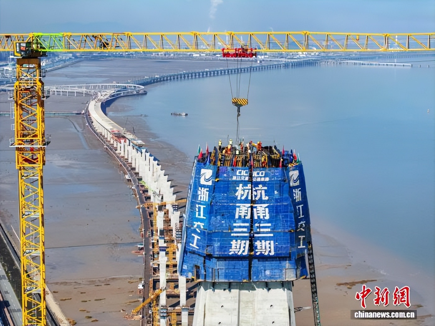 作为项目关键控制性工程,甬江特大桥全长1730米,主塔最高达223米,主跨采用(570+540)米不对称设计,是目前世界上跨径最大的三塔不对称斜拉桥。目前,全桥总体形象进度已超65%。